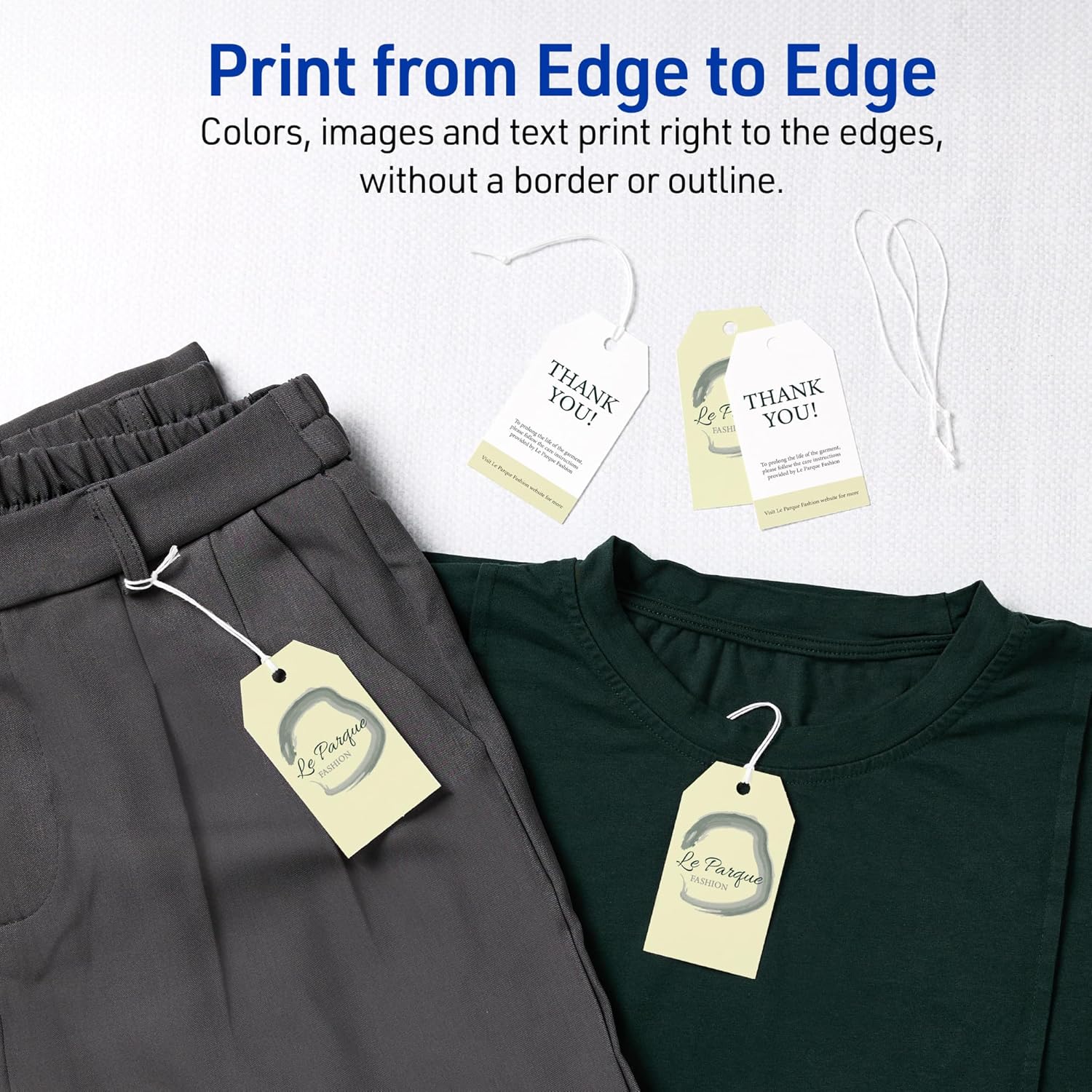 - Create professional-looking double-sided custom tags with our print-to-the-edge feature, allowing for full-bleed designs that extend to the very edge of the tag