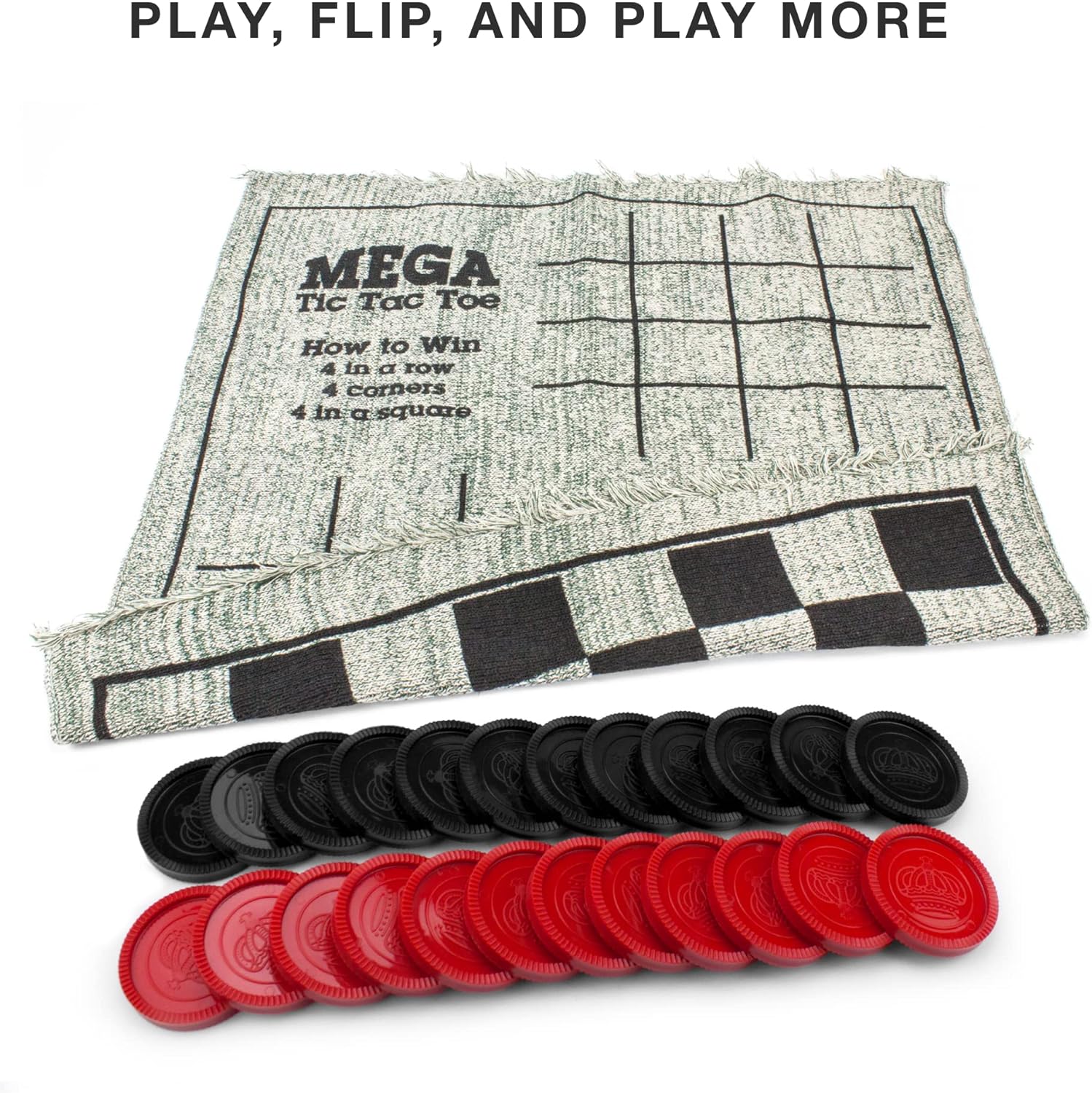 - Reversible Rug - The soft, woven rug measures 26 x 26 in and features a checkerboard on one side. Flip it over for the Tic-Tac-Toe board. Can also be used for chess or as a classy décor for a table. On the go, Roll it up and take it with you