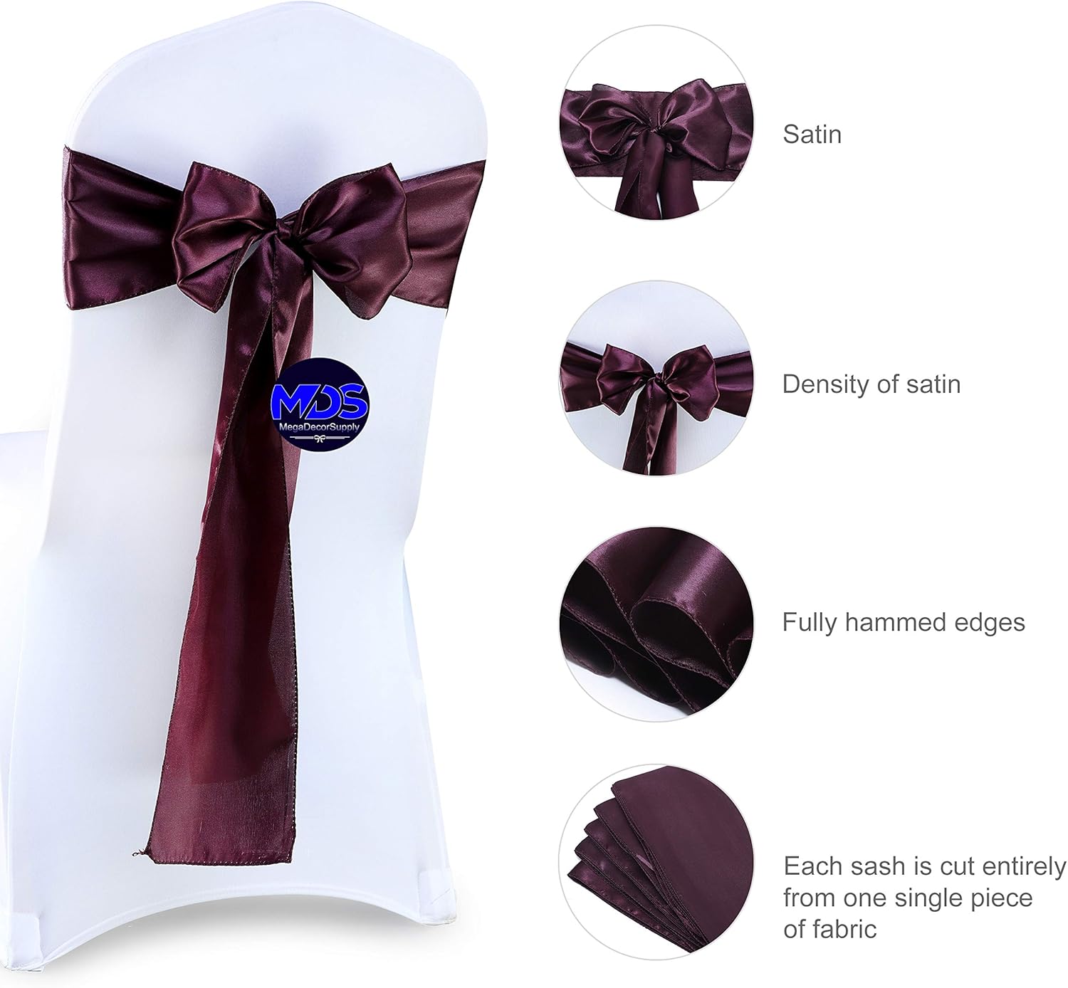 - Material:- MDS chair sashes are made of high quality shiny satin material fabric, Especially if you iron it. It becomes slippery smooth and ultra glossy. Satin has a soft, shiny finish filament fiber such as silk, polyester, or nylon Chair Bows Sashes can match with any color chair cover. These chair sashes can give your chairs a uniform and professional look. Simple to use. Make your guest impress.