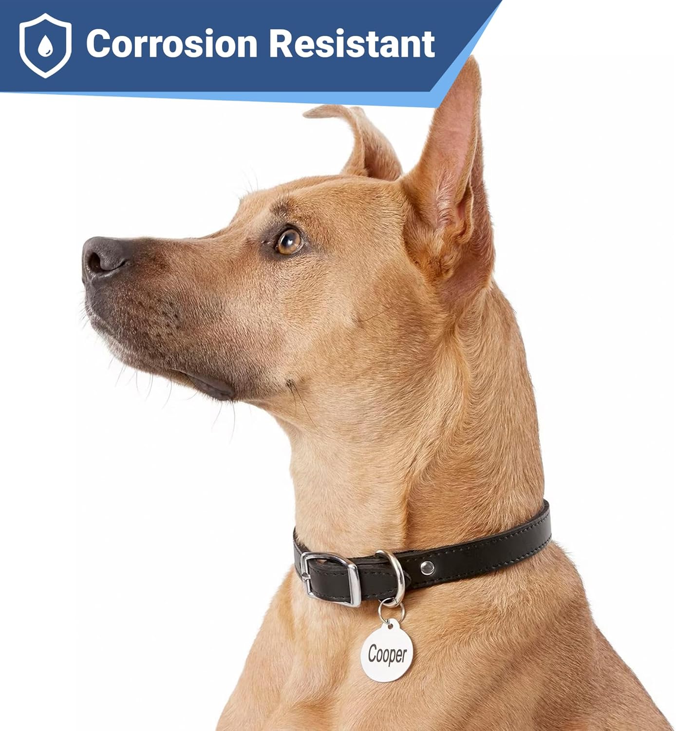 GoTags Stainless Steel Pet ID Tags, Personalized Dog Tags and Cat Tags, up to 8 Lines of Custom Text, Engraved on Both Sides, in Bone, Round, Heart, Bowtie and More (Round, Regular (Pack of 1))