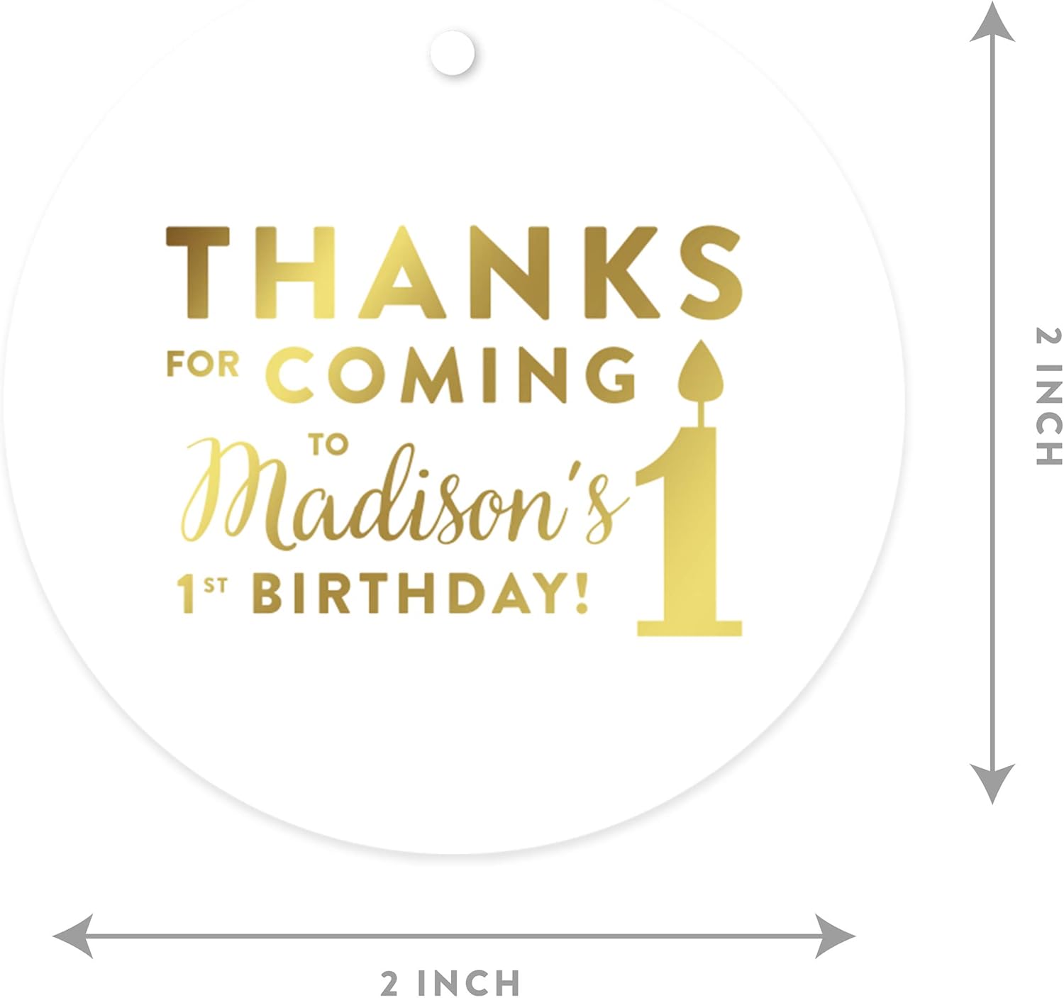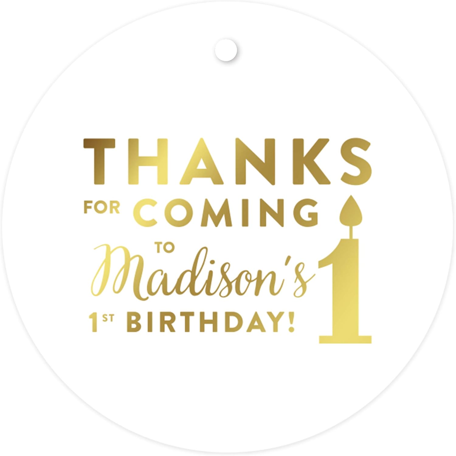 Andaz Press Personalized Round Circle Birthday Gift Tags, Metallic Gold Ink, Thanks for Coming to My 1st Birthday, 24-Pack, Custom Made Name