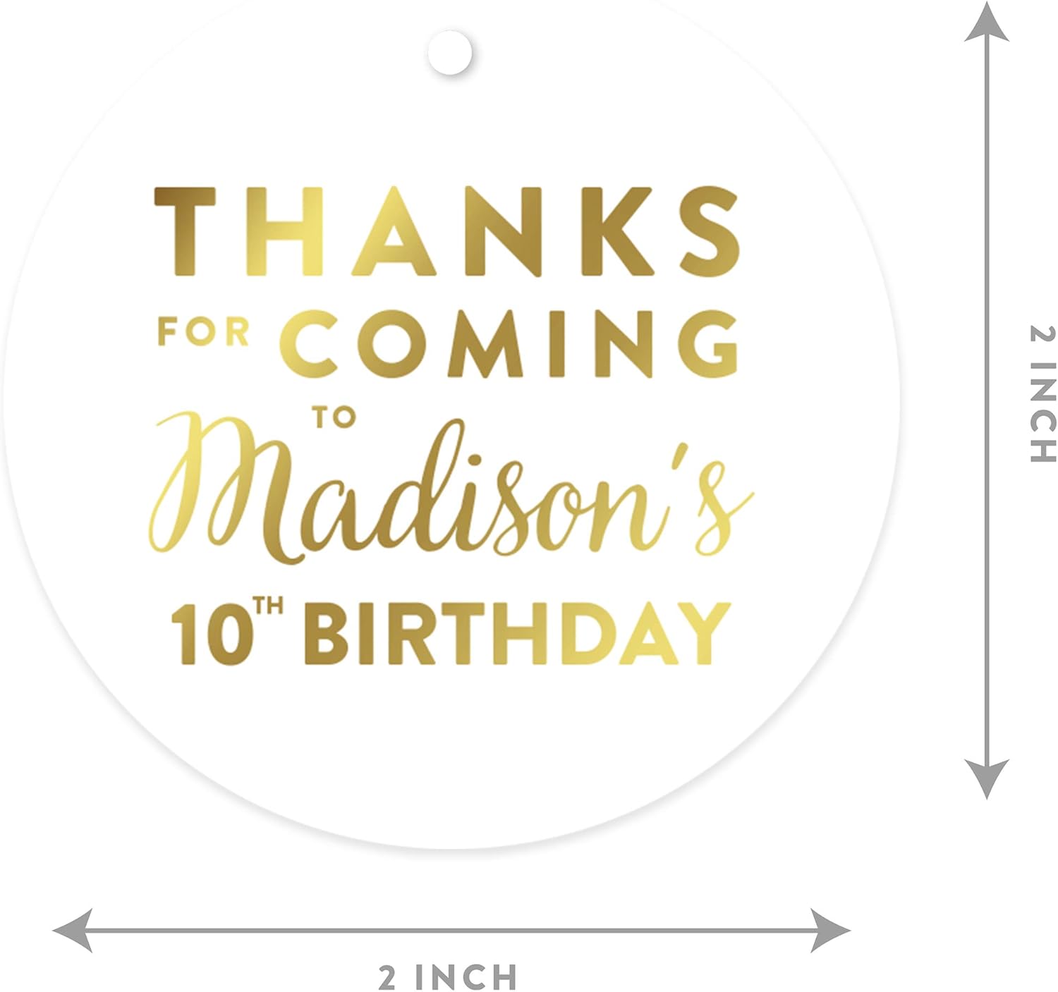 Andaz Press Personalized Round Circle Birthday Gift Tags, Metallic Gold Ink, Thanks for Coming to Madison's 10th Birthday Block Style, 24-Pack, Custom Made Name Age