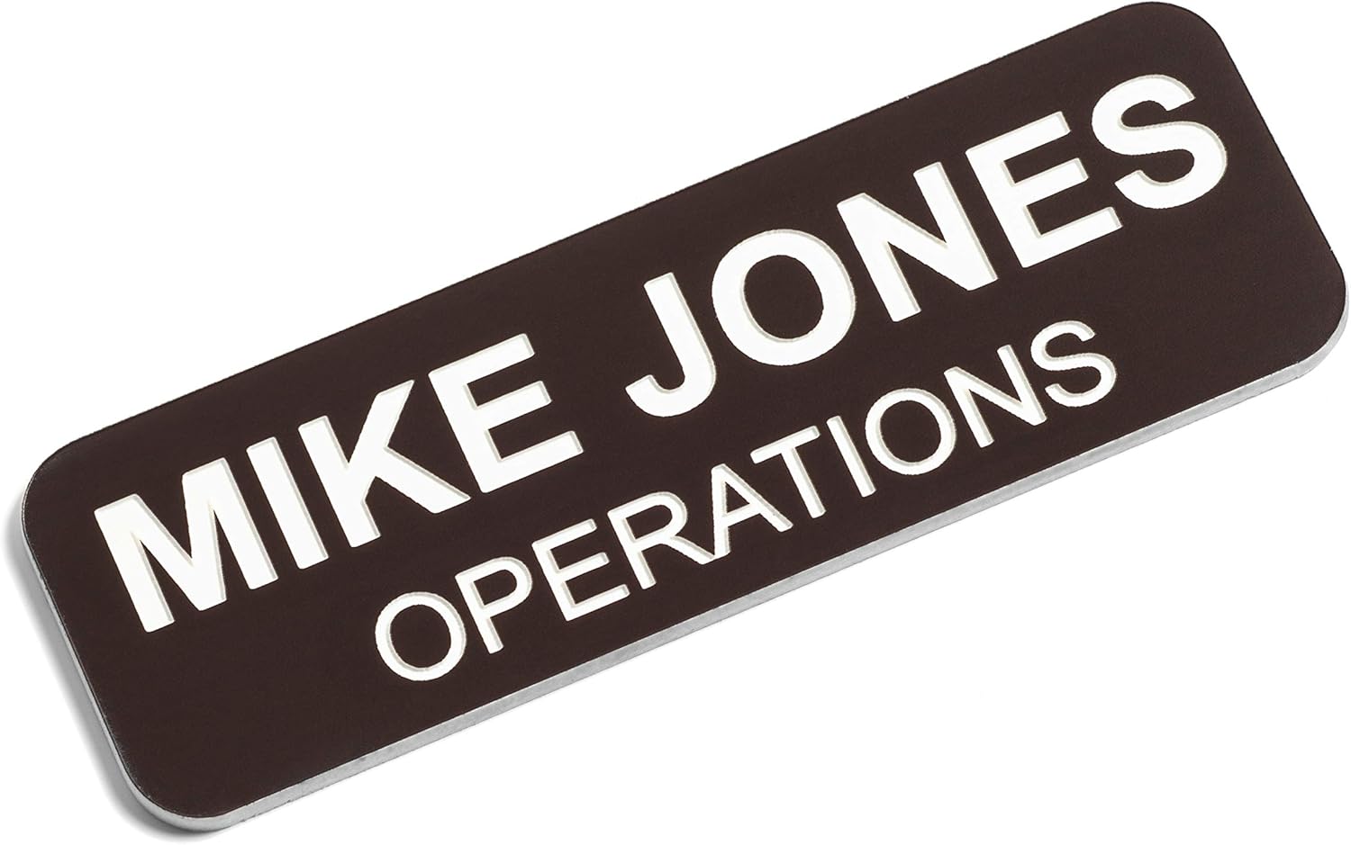 Custom Engraved Name Tag Badges – Personalized Identification with Pin or Magnetic Backing, 1 Inch x 3 Inches, Dark Brown/White