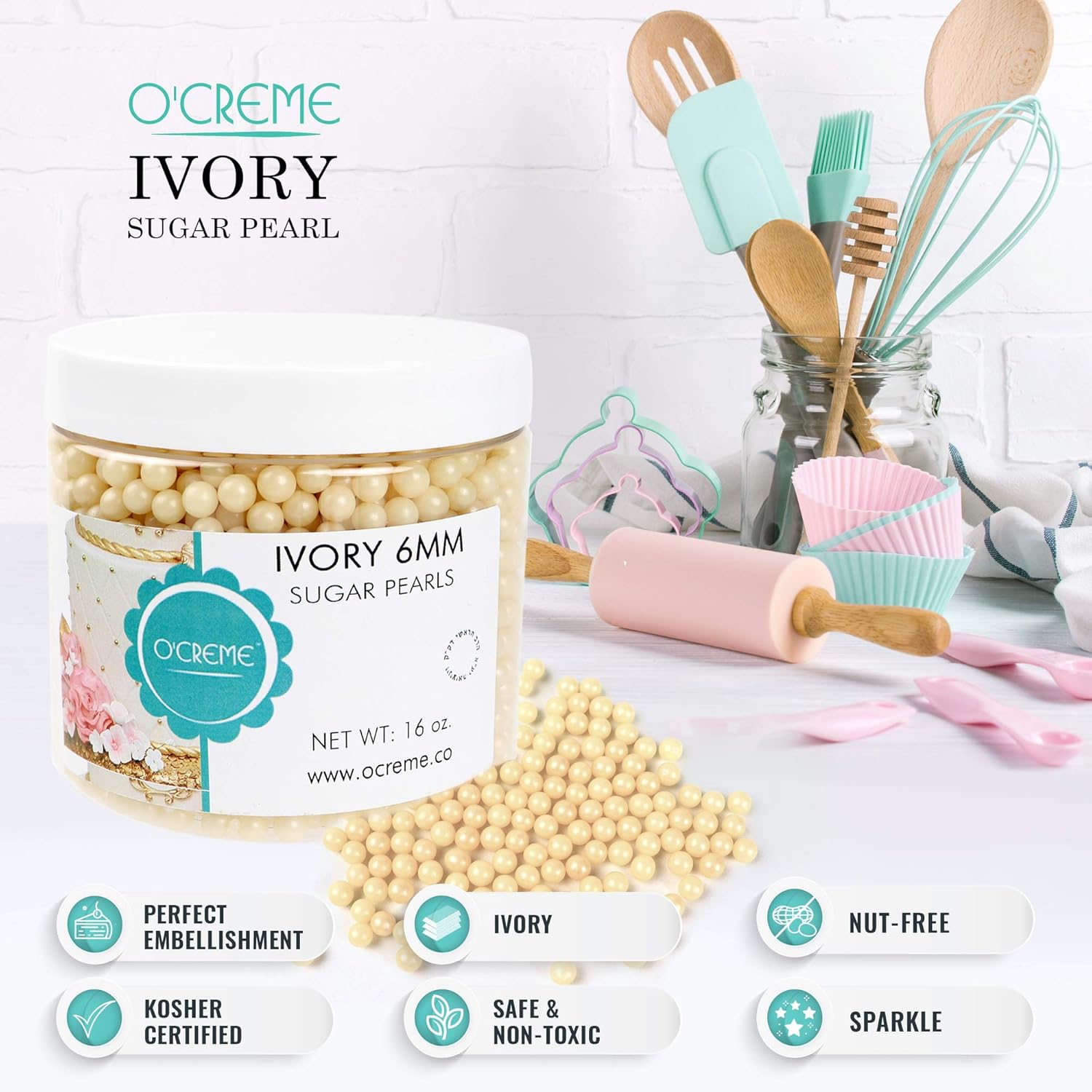 O'Creme Ivory Edible Sugar Pearls Cake Decorating Supplies for Bakers: Cookie, Cupcake & Icing Toppings, Beads Sprinkles For Baking, Certified, Candy Sugar Ball Accents (10mm, 8 Oz)