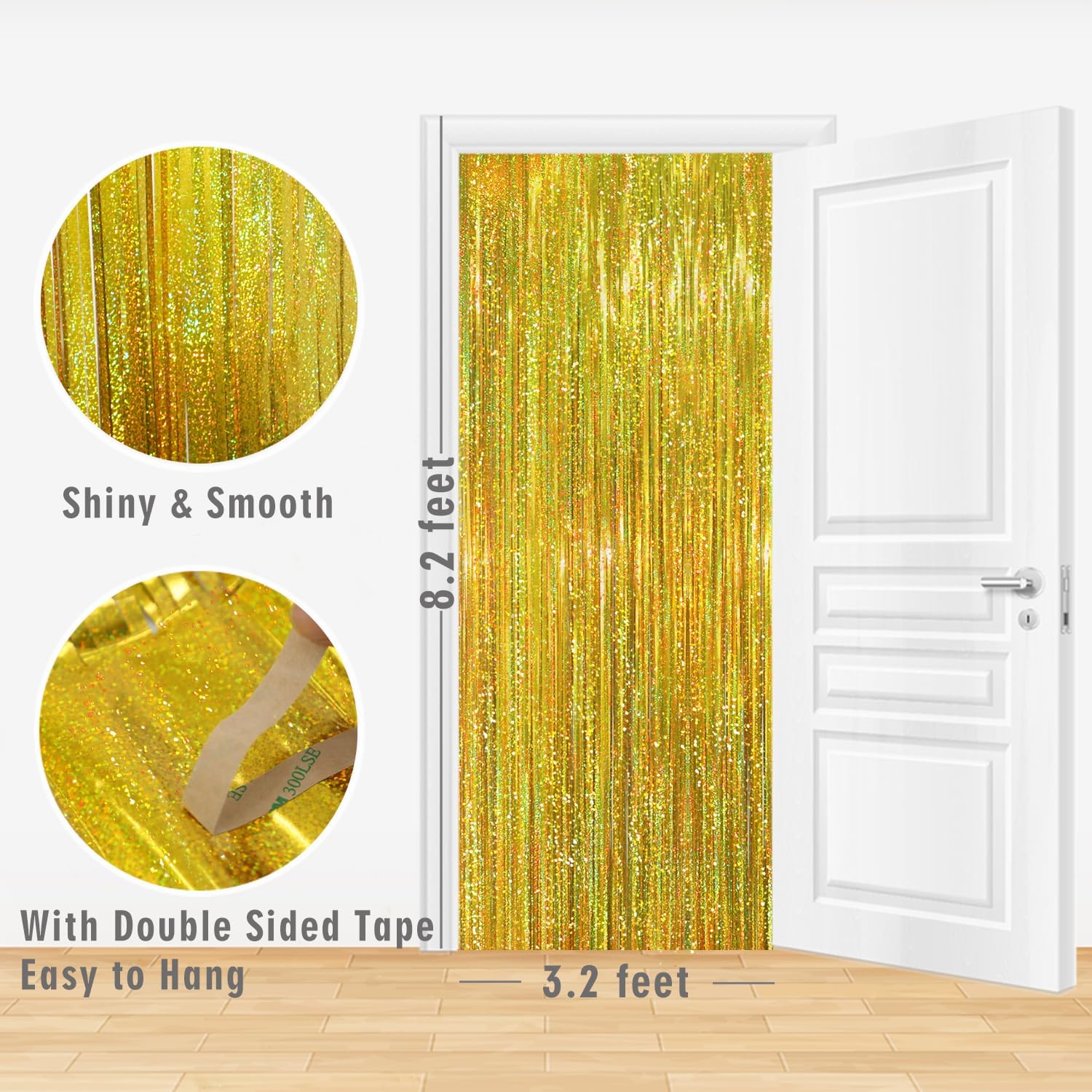 - Package Includes:3 pack shiny gold foil fringe curtains,3.2 ft x 8.2 ft each,suitable for hanging on a door or coverage a wall fully