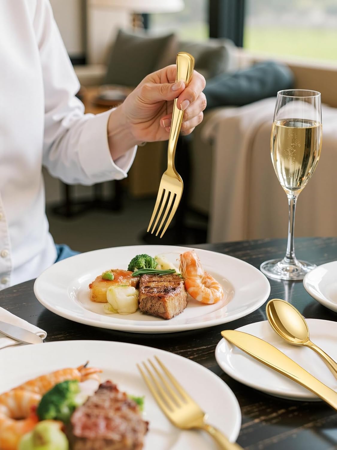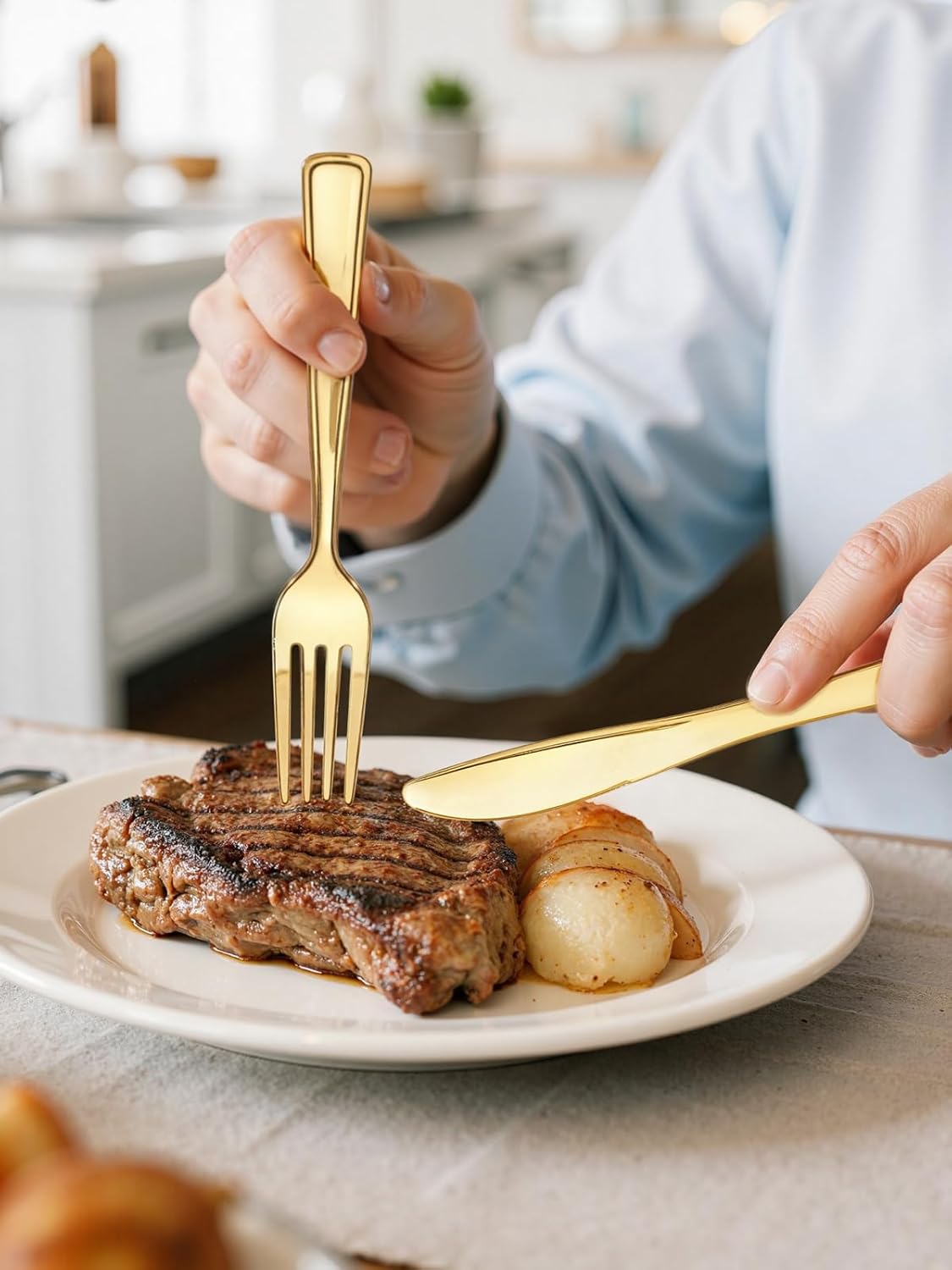 - AUTHENTIC LOOK AND FEEL: We sourced the gold utensils set disposable that shines and shimmers like real gold. The heavyweight durable design prevents breakage and can stand up to manual washing for reuse.