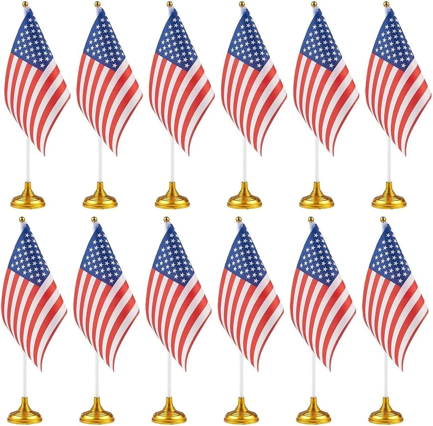 Juvale Mini American Flag Decor Set - 12-Pack 8 x 5.5in Flags on 12in Poles with Gold Base - Patriotic Table Decorations & Party Supplies for Desk & Office