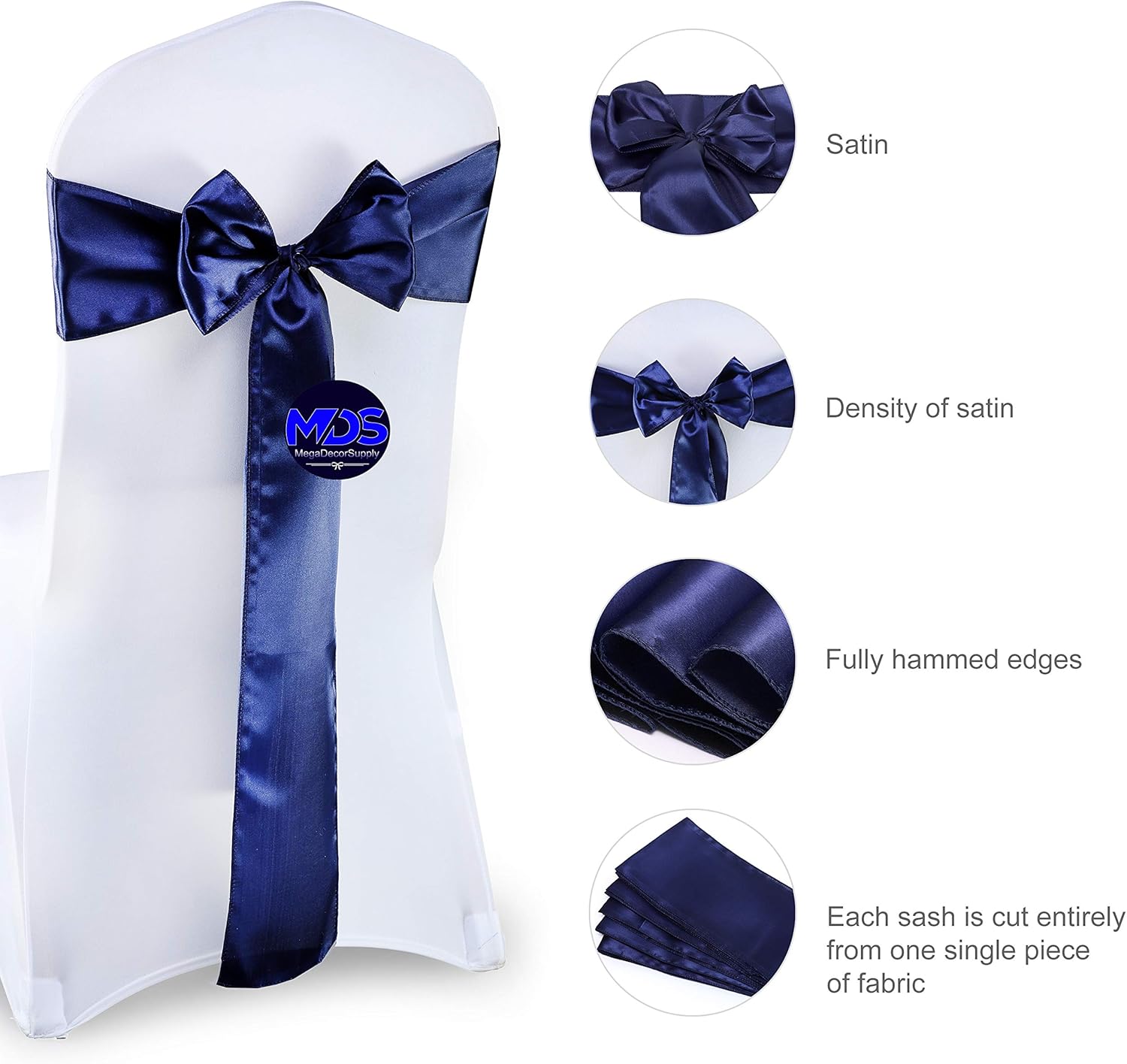 MDS Pack of 75 PCS Satin Chair Sashes Charmeuse Sateen Dining Chair Bows Ribbon Ties Back Sash for Wedding Party Birthday Home Hotel Restaurant Banquet Decoration (7 x 108 Inch, Navy Blue)