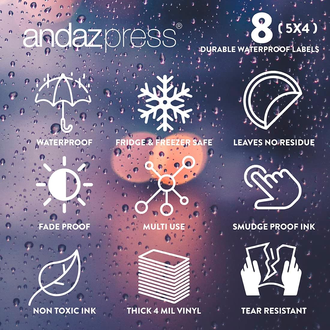 - INCLUDES: 8 wine bottle adhesive label stickers, designed by Andaz Press. Does not include wine bottle.