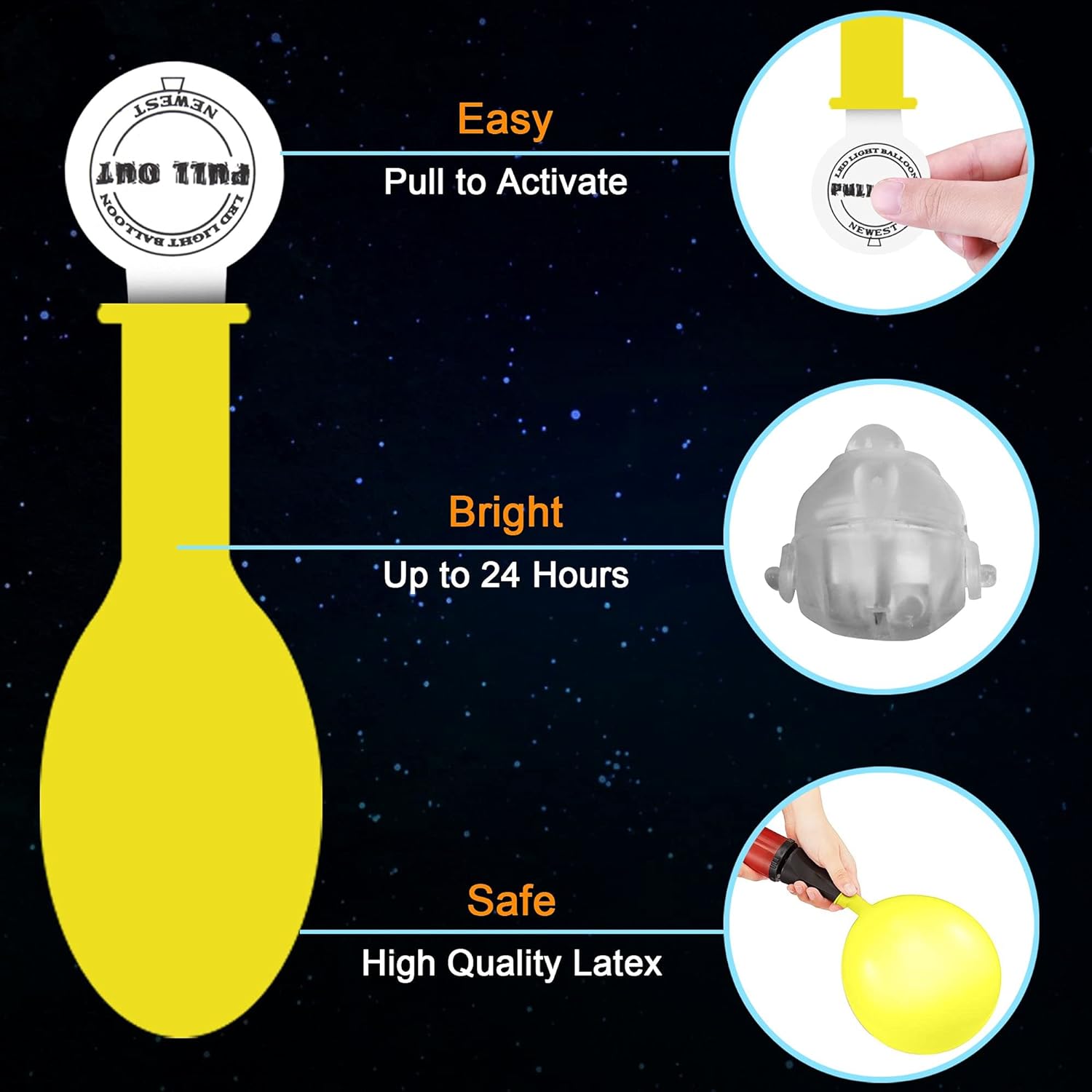 - Bright & Long-lasting: Integrated premium flashing LED lights keep bright for 12 to 24 hours; Pull out the tags in glow balloons to activate