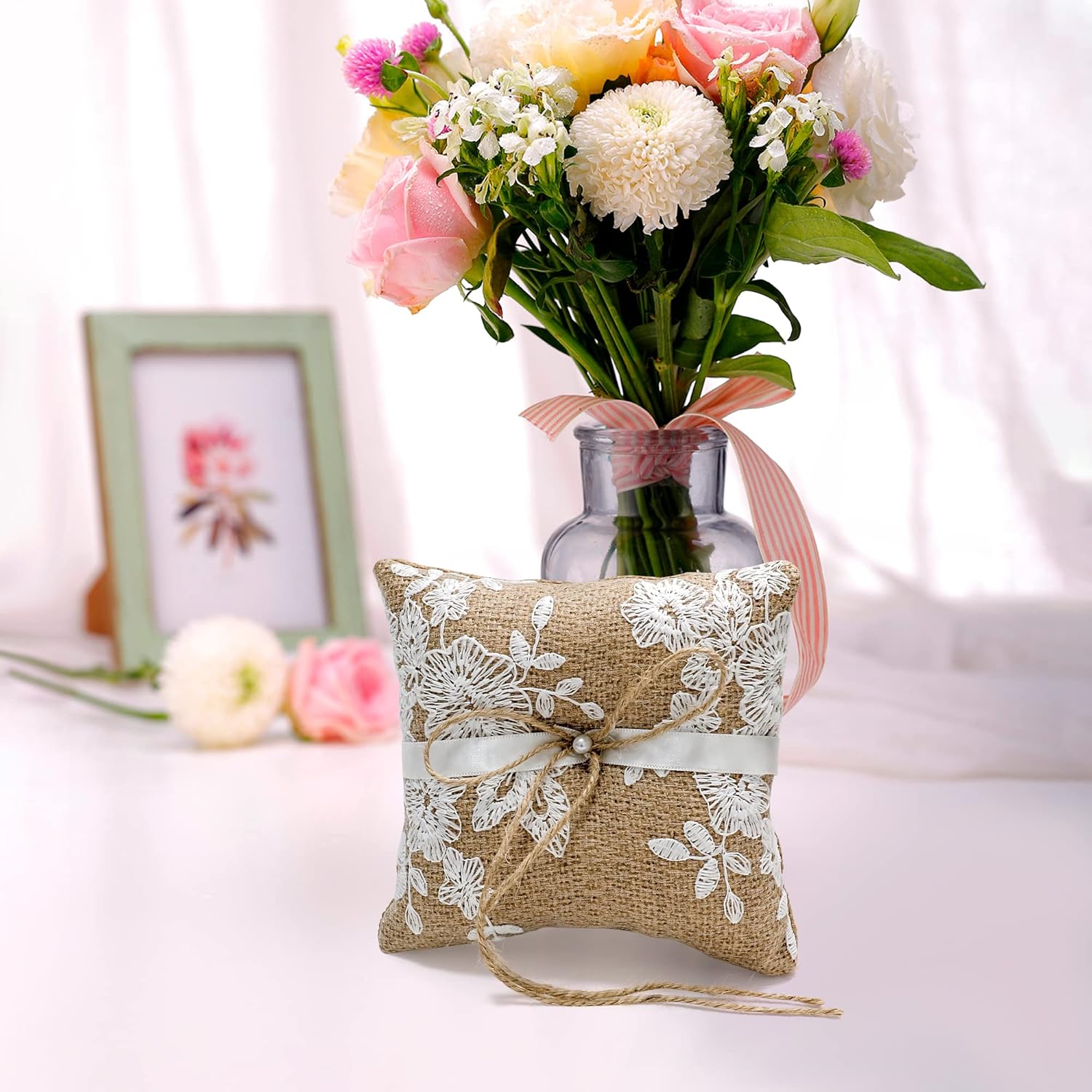 - β Ring Bearer Pillows: Burlap ring bearer pillows cushion Size:5.9*5.9 inch. MATERIAL- Burlap, lace. Rustic shabby retro wedding ring pillow is decorated with middle white embroidered floral lace trim and bowknot.