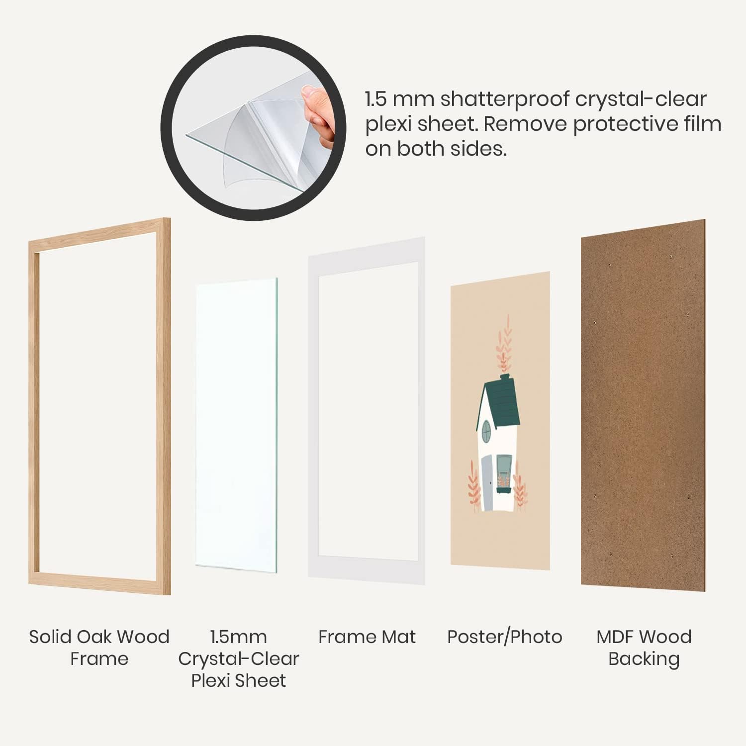 - SPECS & INCLUSIONS - 5x7 picture frame (inches), 13x18 cm, sold as a Set of 2. Natural solid oak wood, 0.6 in wide, 0.8 in deep. Posters & hanging accessories are not included. Robust packaging in corrugated boxes with corner protection. High-quality 4x6 in-frame mat included, removable for larger pictures.