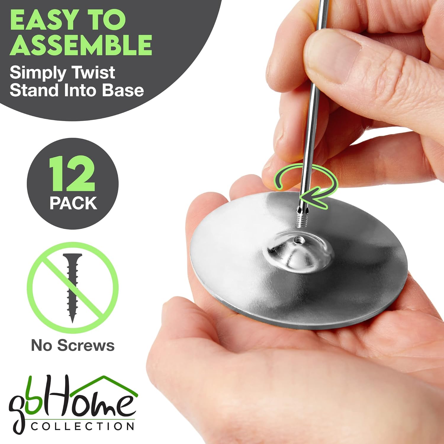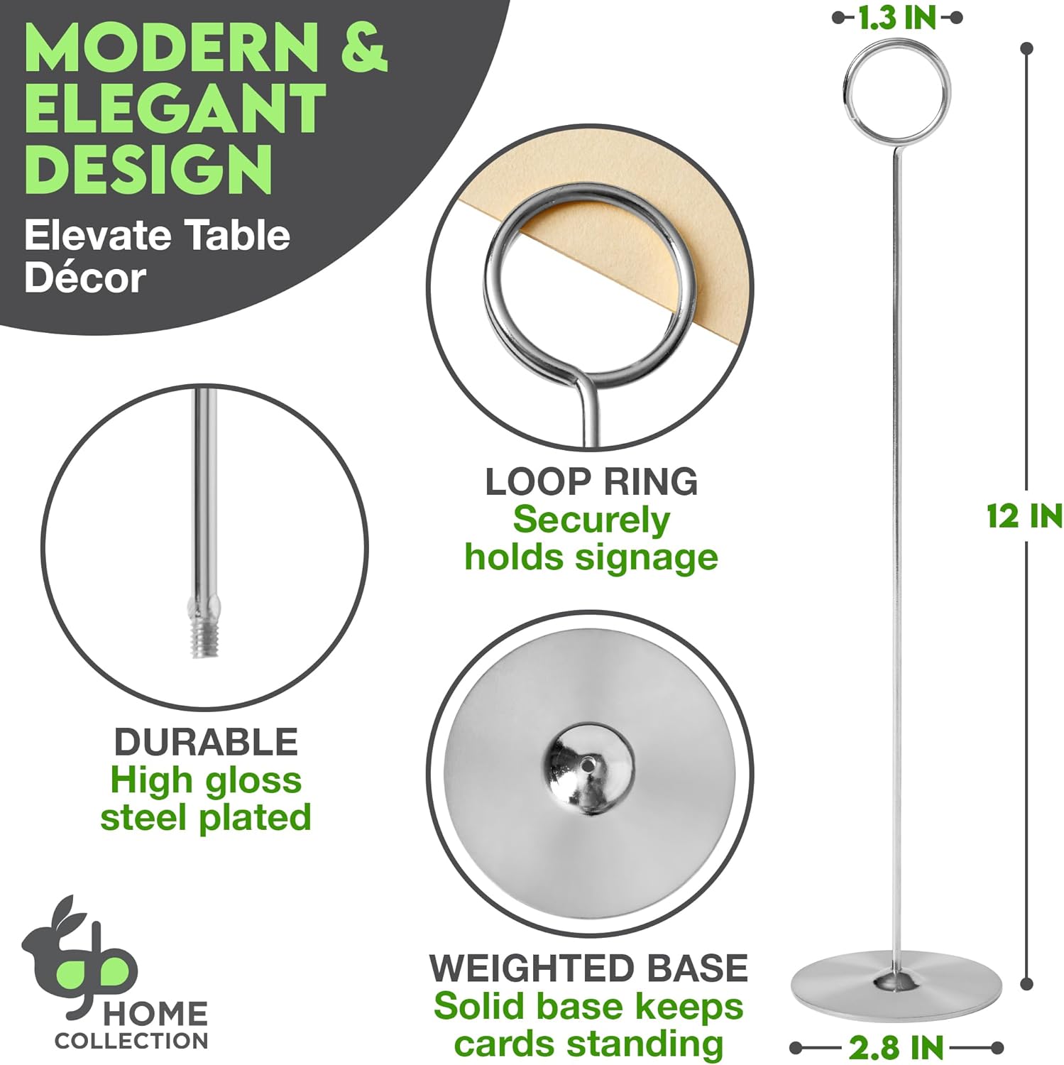 - PREMIUM QUALITY: 12 Chrome place card holders for table with premium quality steel construction. Sleek, durable & fade-resistant. Each 12-inch tall unit has a 2.8-inch diameter base for stability. No chipping or cracking issues.