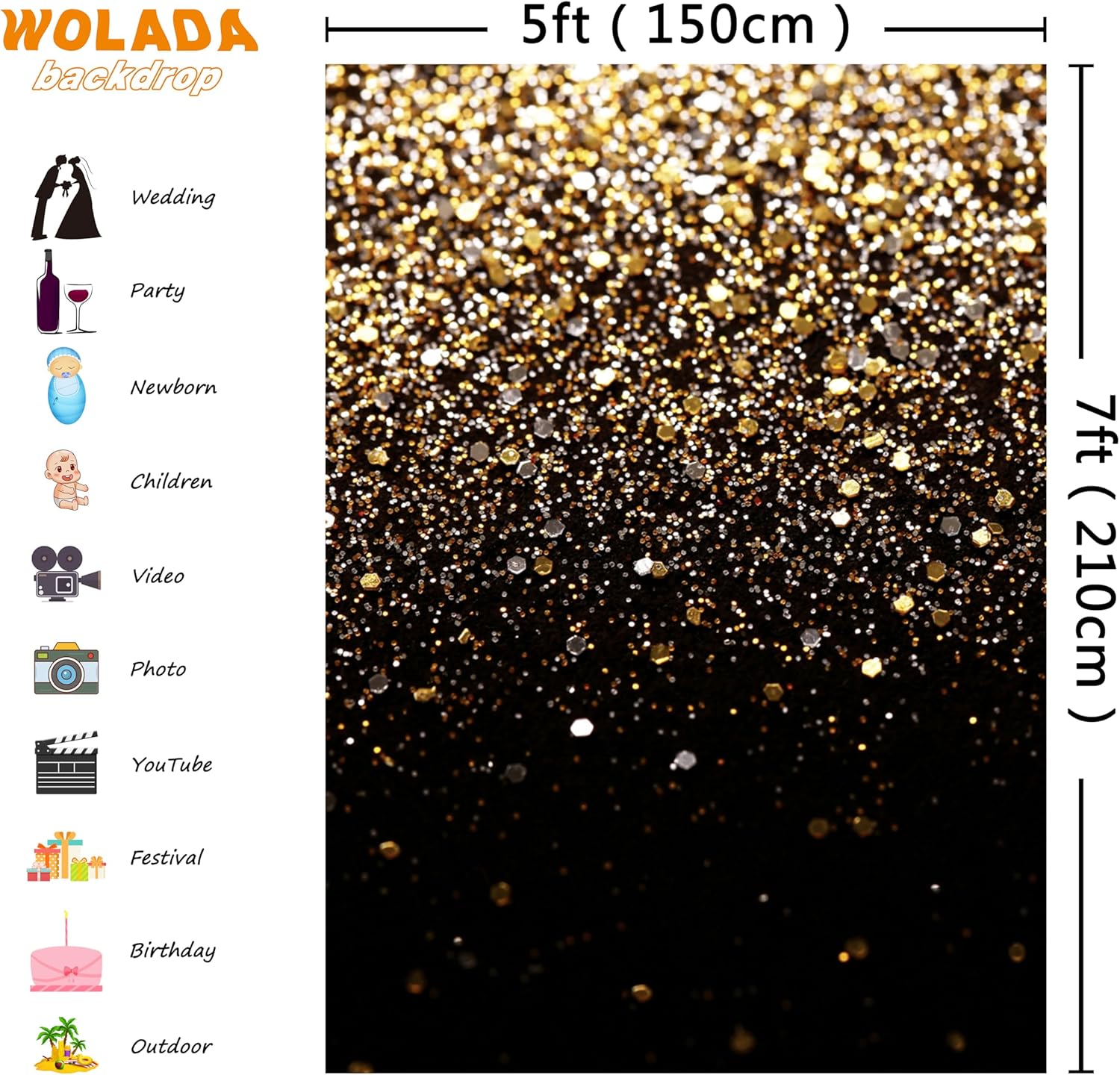WOLADA Black and Gold Backdrop Golden Glitter Backdrop for Photography Wedding Birthday Baby Shower Party Photo Studio 5x7FT 11412