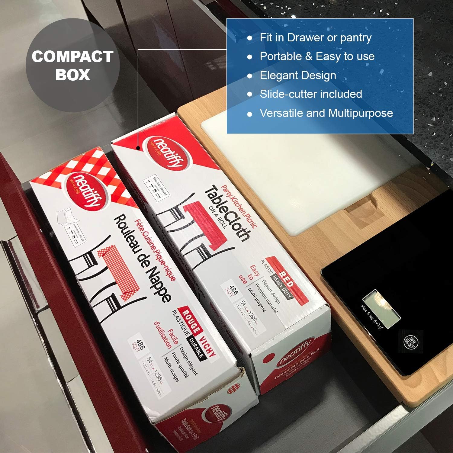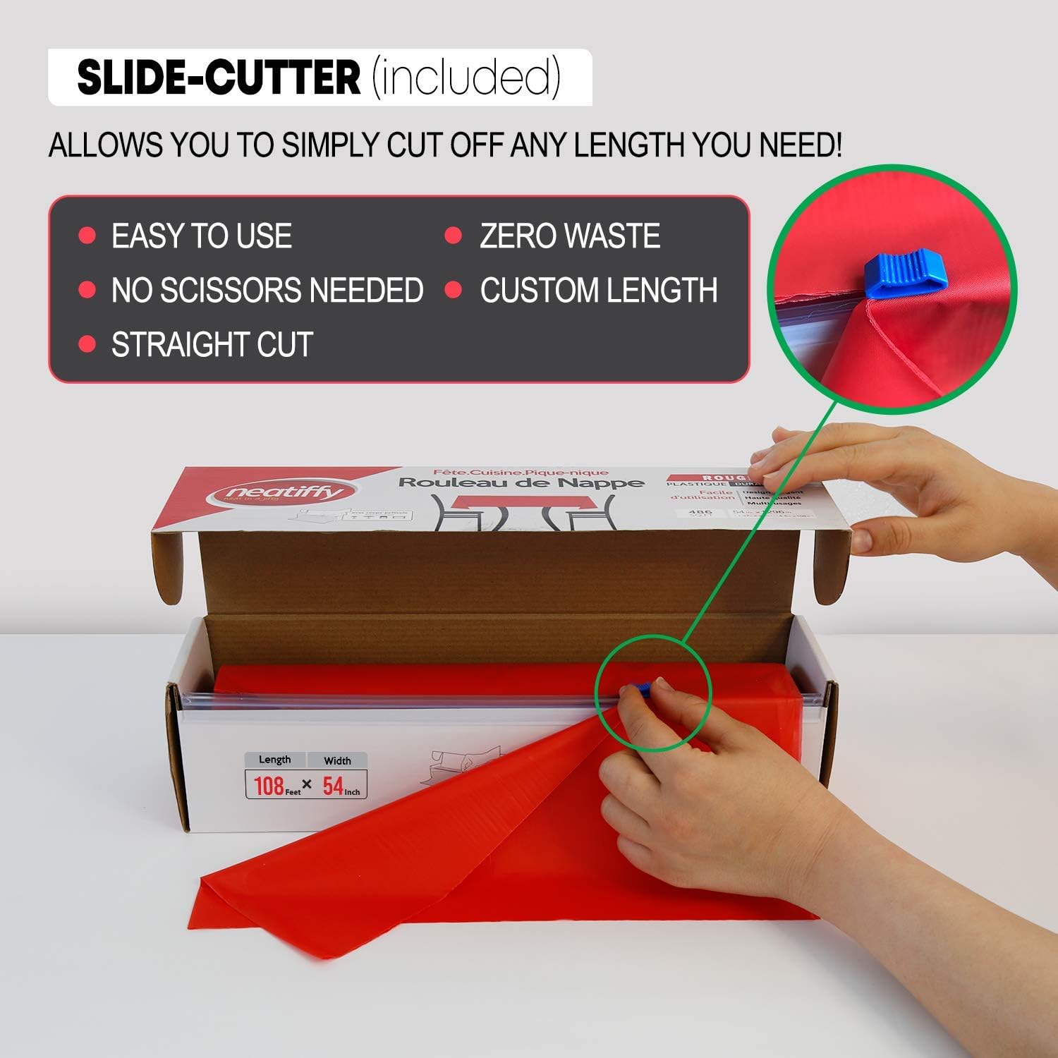 - ✔️SLIDE-CUTTER FOR CUSTOM LENGTH: Cut to suit your preference and party needs! Each roll of tablecloth is equipped with a slide cutter, allowing you to create a perfectly sized plastic cover for Rectangle, Square, Round or Oval tables. Our covers are neatly rolled in a box, so you can cut as much as you need while keeping the rest for later.
