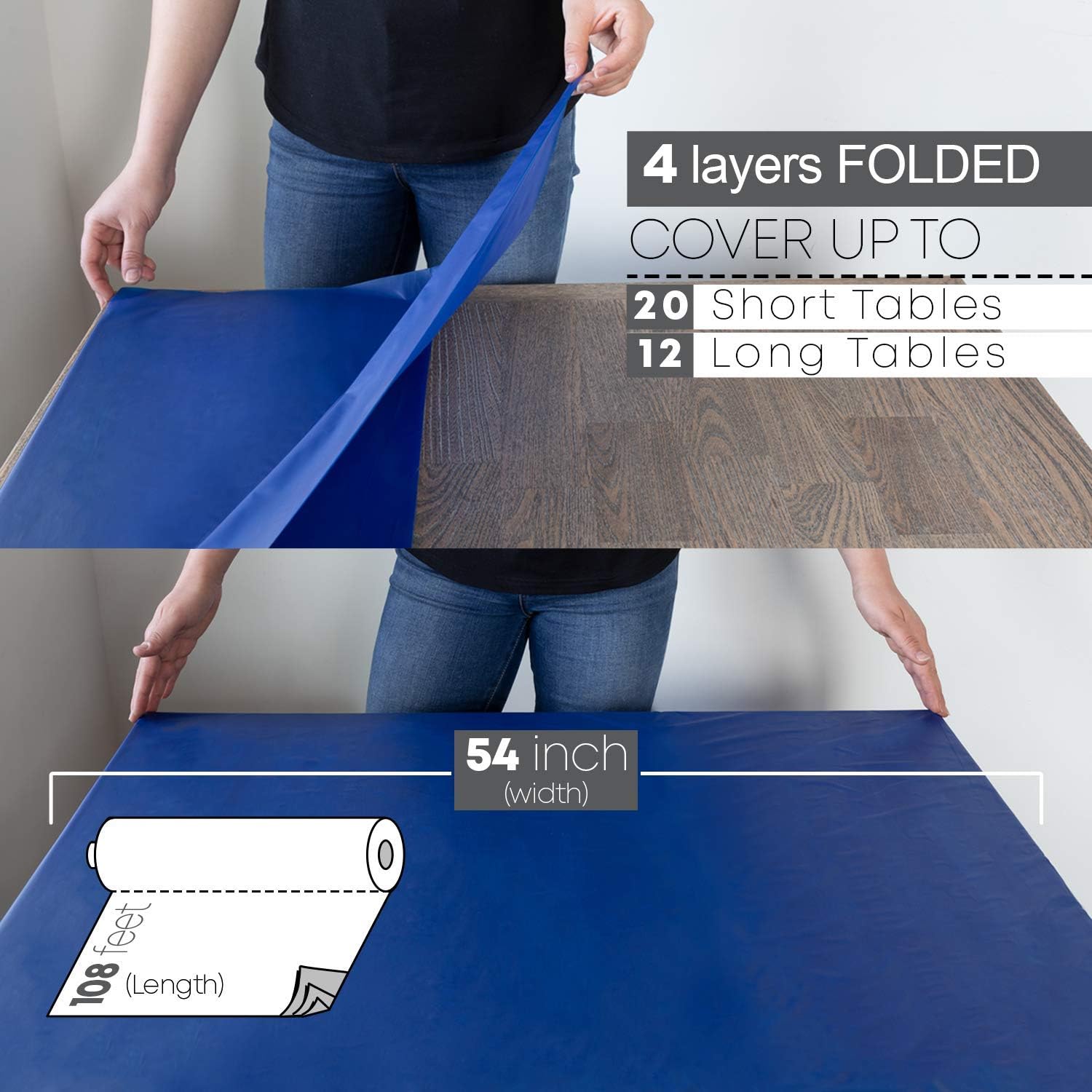 - ✔️PREMIUM QUALITY & 100% SATISFACTION GUARANTEE: Our party essential roll is smell-free made of thick plastic which weighs 110g per 54" x 108" sheet (20g more than others). It can cover up to 12 big 8-inch long tables. Our high-quality plastic cover is wrinkle-resistant, providing superior protection to your table against stains, spills, and scratches at outdoor or indoor events.