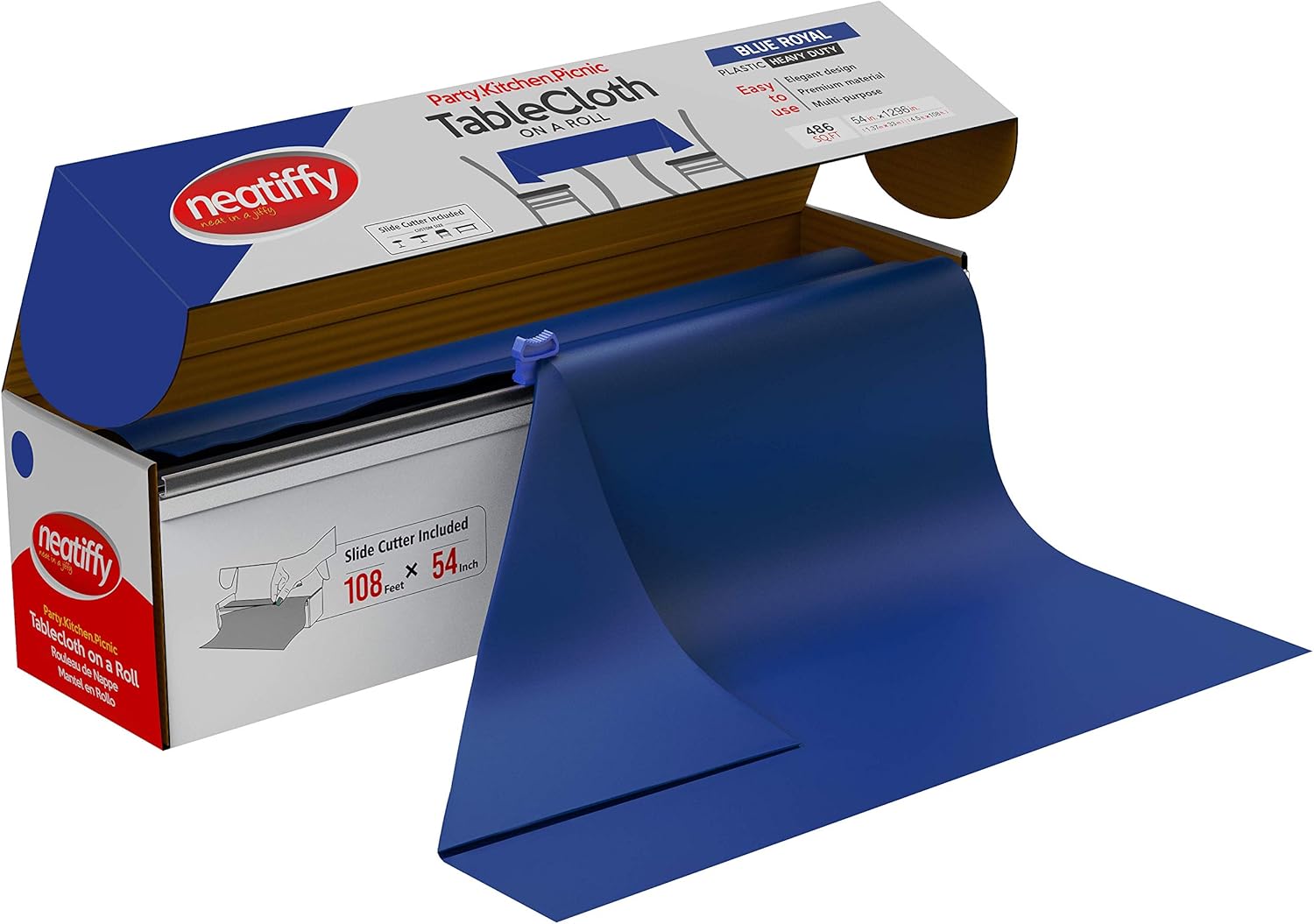 Neatiffy Disposable Plastic Table Cloth Roll | 54 in x 108 Ft Waterproof Tablecloth | Table Cover for Rectangle, Square, Round Oval Tables | Picnic, Party, Banquet, Birthdays, Weddings - Royal Blue