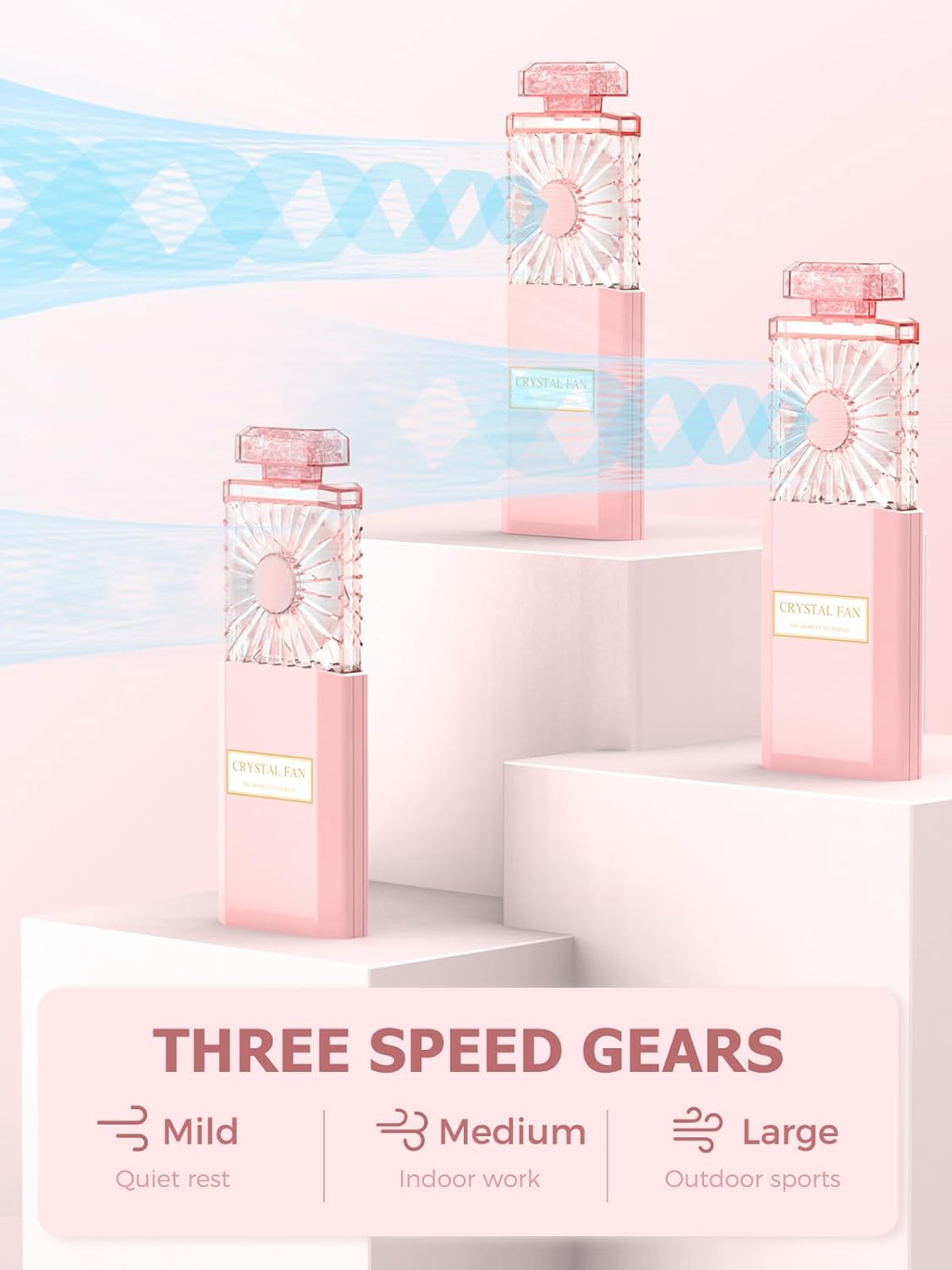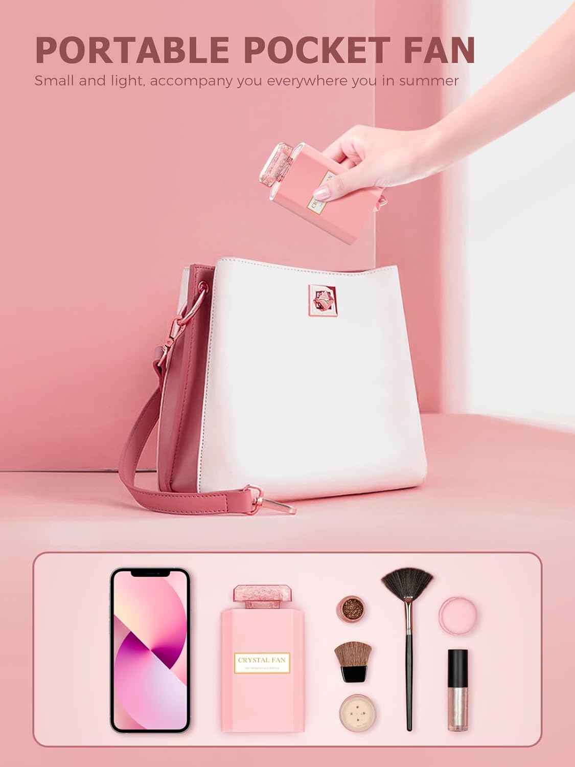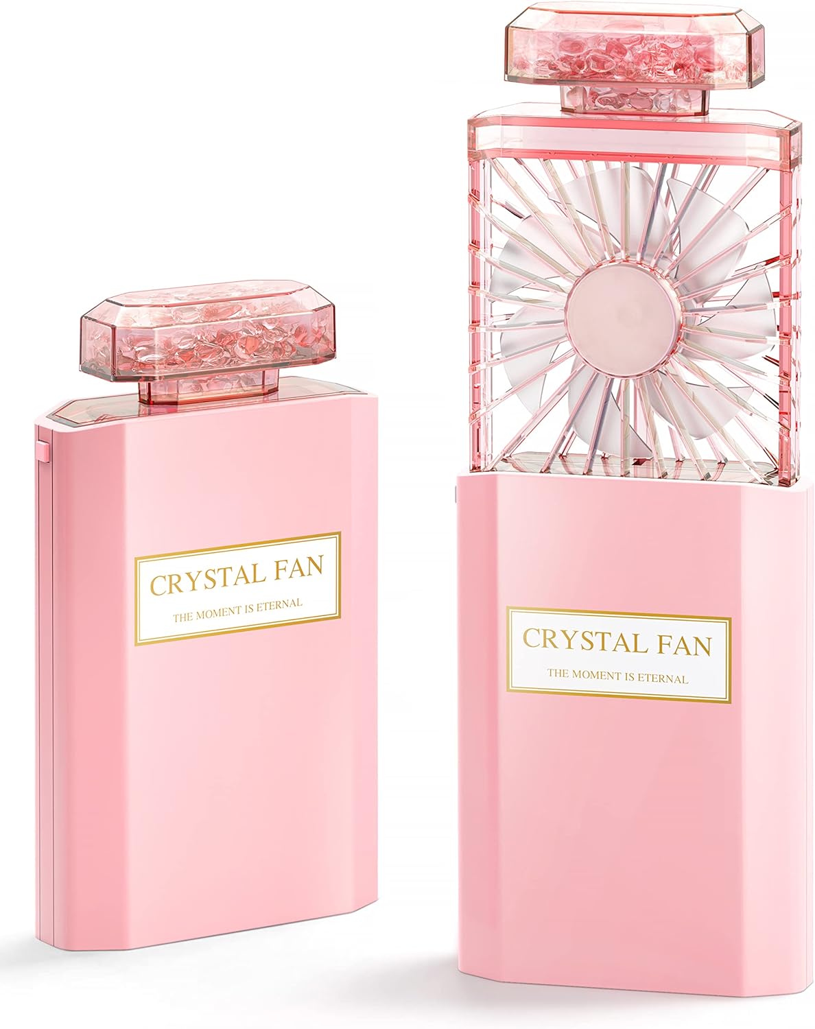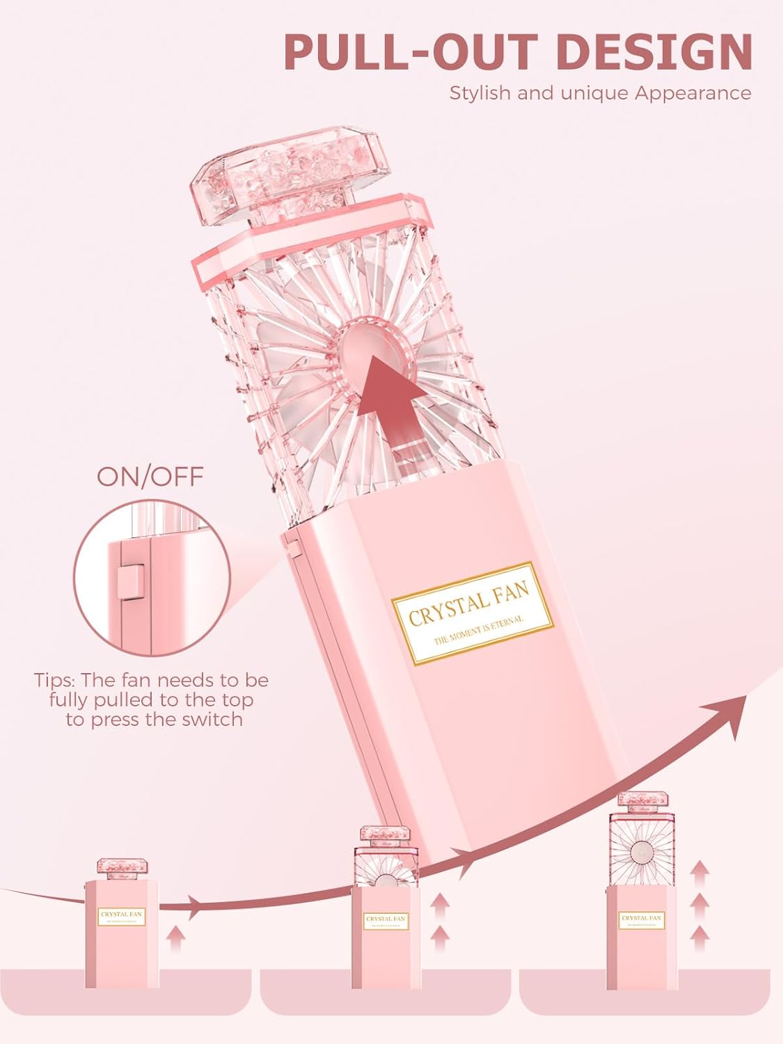 - ăPORTABLE DESIGNăPortable personal fan has like perfume bottle, pull-out designeasily put in your handbag or pocket. This handheld fan so lightweight only weighs 125g. Easy carried for you to work, travel, school and keep cool whether outdoors or indoors in summer