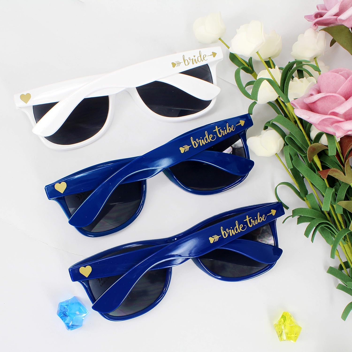 - Bachelorette Sunglasses Set---This Bachelorette Sunglasses kit contains a total of 1 Pair of white 'Bride' Sunglasses, 9 Pairs Navy 'Brides tribe' Sunglasses for bridesmaid. Great idea for Bachelorette party and bridal party.