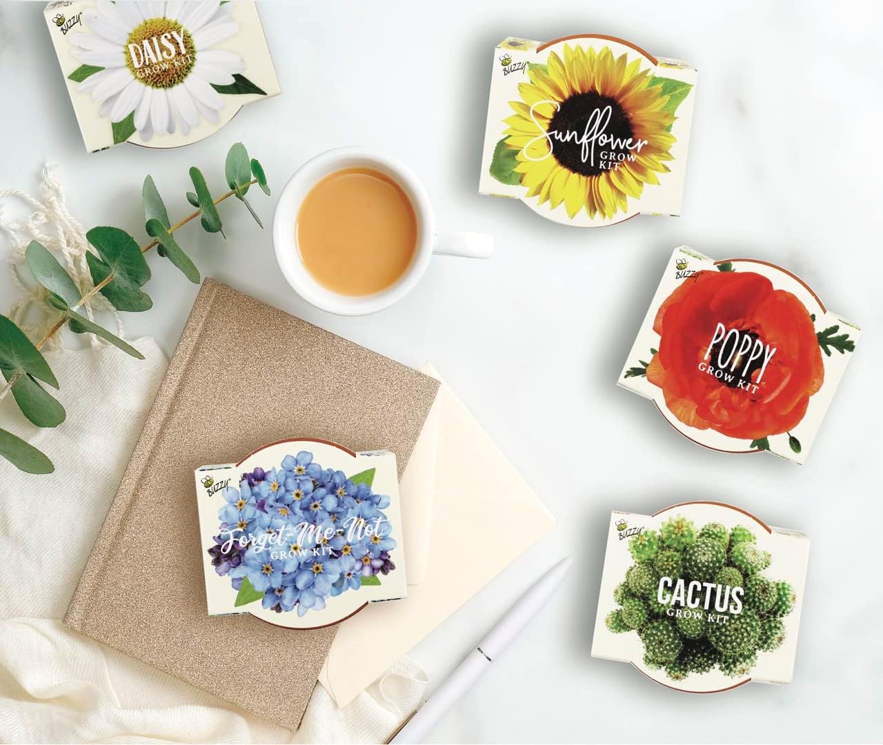 BUZZY Seeds Mini Terracotta Pots 12-Pack with Plant Seeds, Poppy, Sunflower, Daisy, Cactus and Forget Me Not, All-in-One Seed Starter Kit, Indoor Outdoor Gardening Gift, Wedding Favors