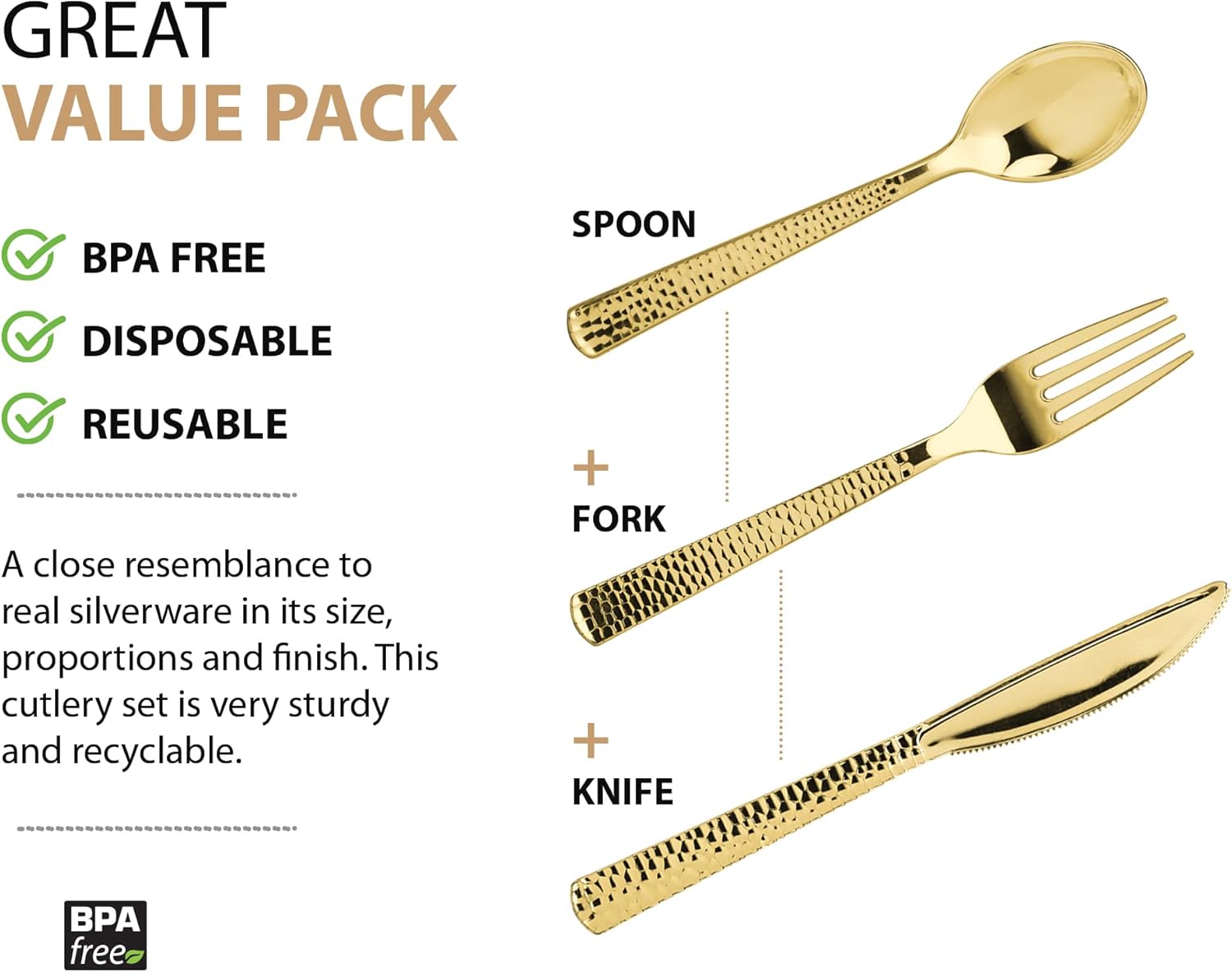 Plastic Cutlery Silverware Extra Heavyweight Disposable Flatware, Full Size Cutlery Combo, Gold Pebbled, 80 Forks, 40 Spoons, 40 Knifes, Value Pack 160 Count