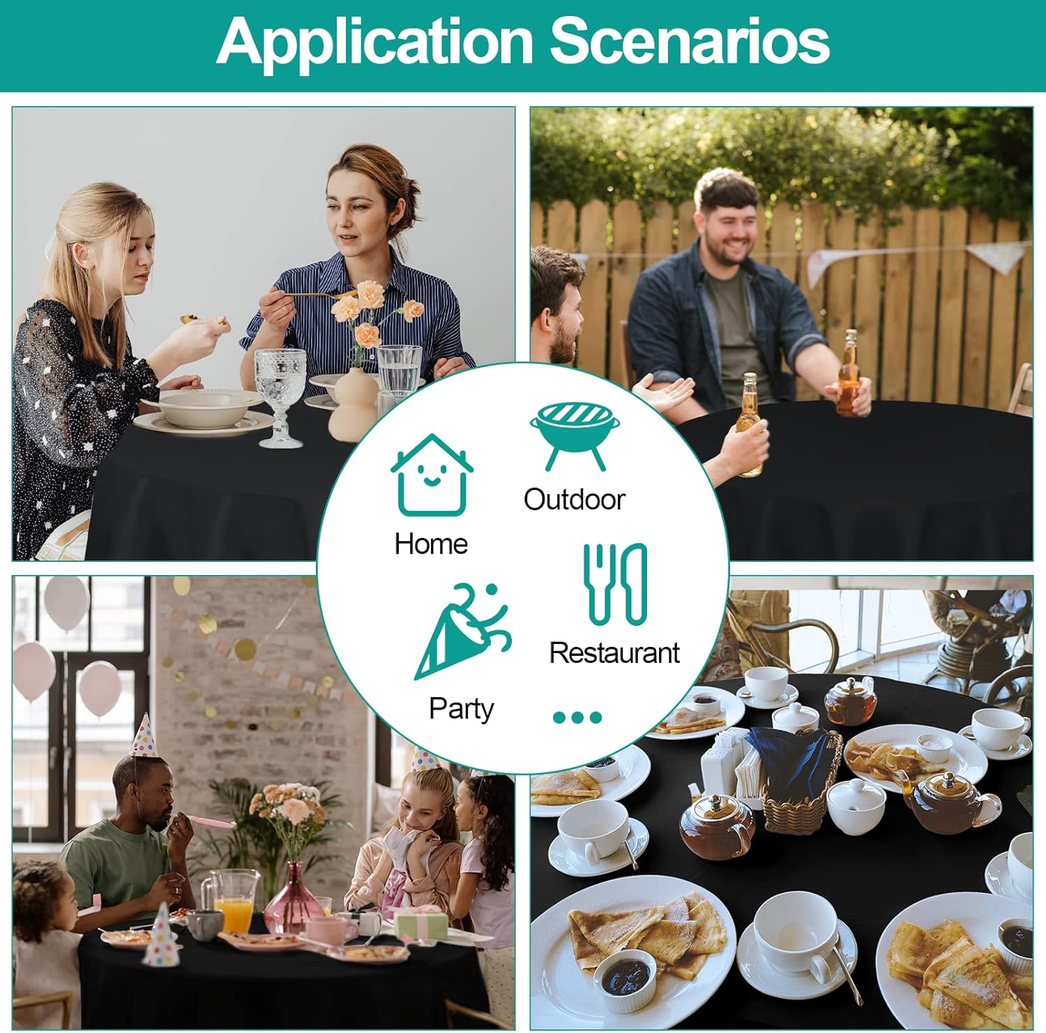 - 【Packing and Dimensions】Please measure the size of the table carefully before purchasing. You will get 1 pack black table cloth in one order. The table cloth is 120 inch in diameter. It will be packed and come in a transparent plastic bag