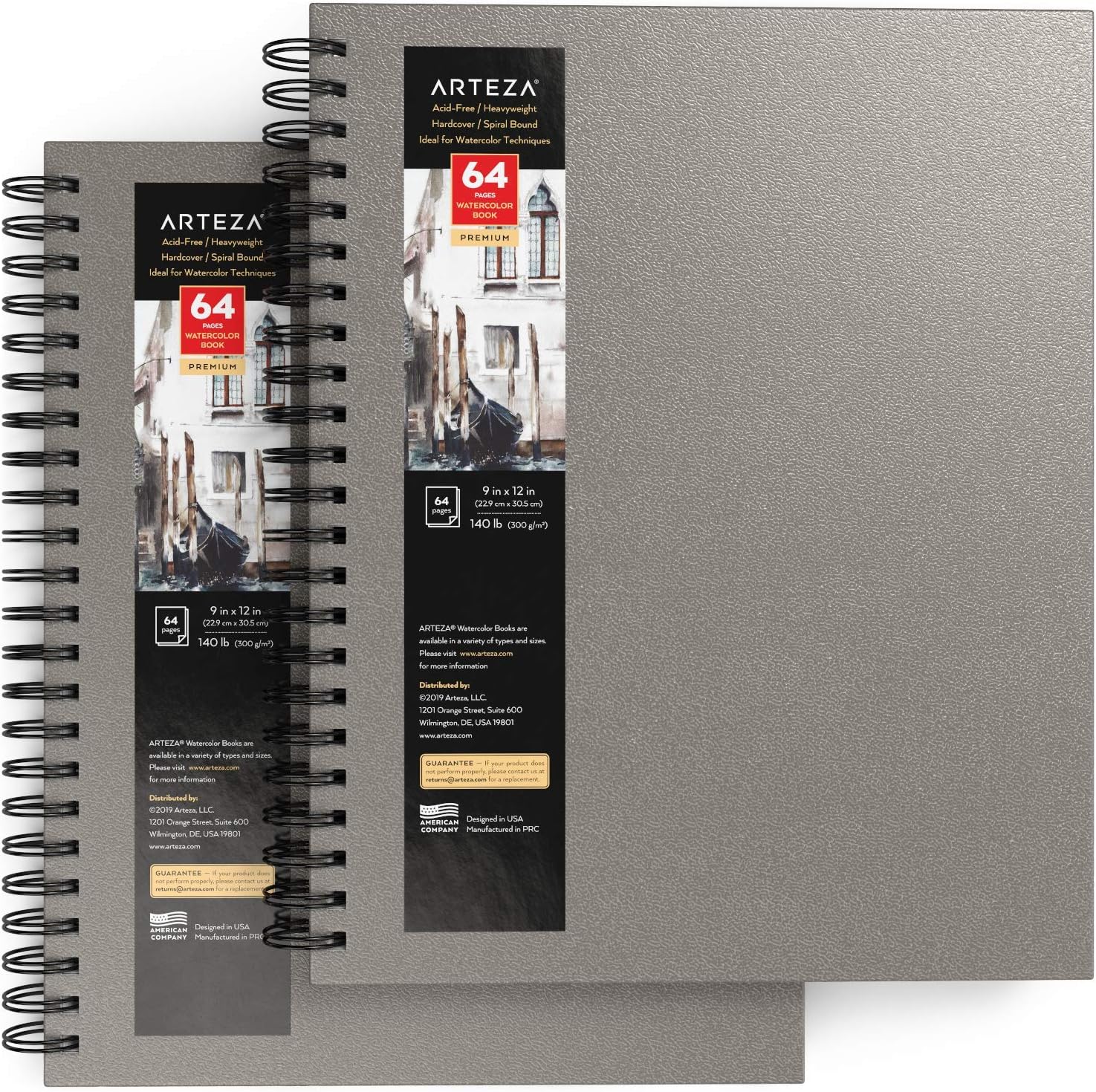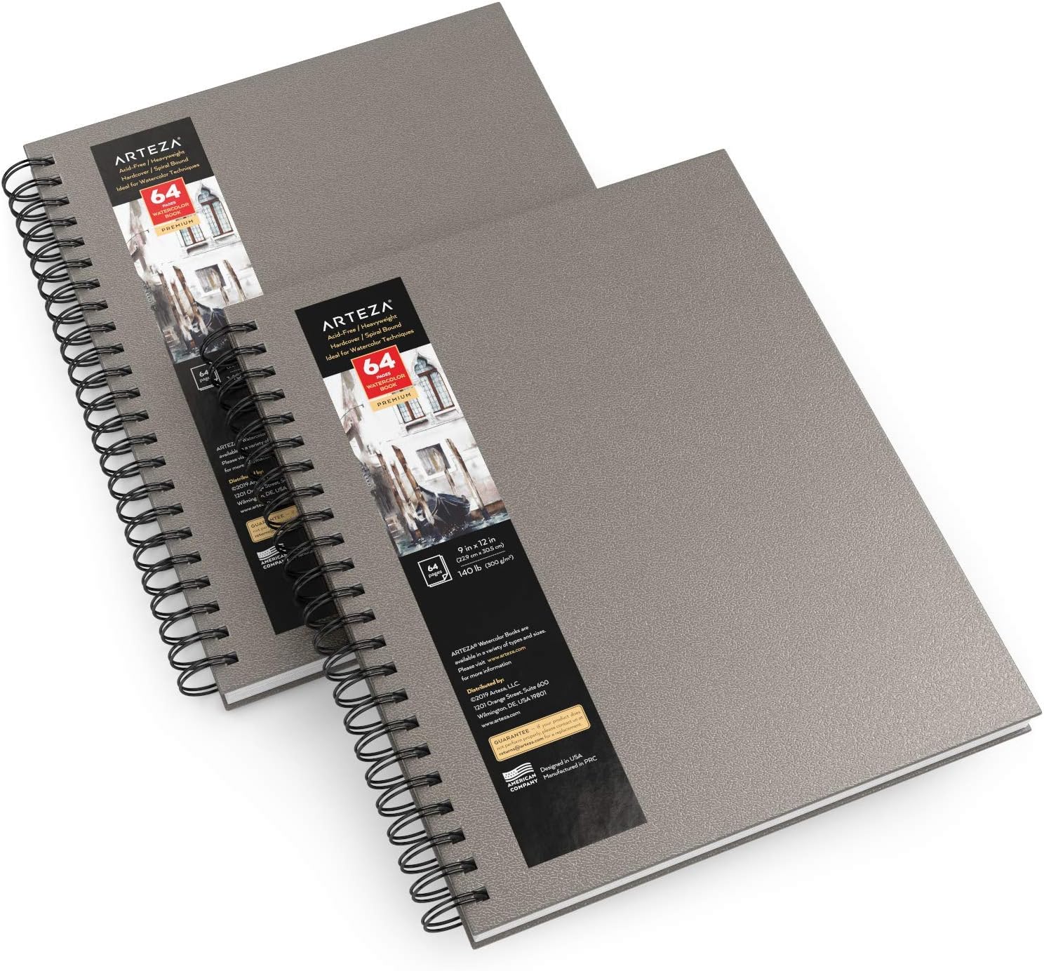 ARTEZA Watercolor Sketchbook 2-Pack, 9x12 Inches – 64 Pages Each, Spiral-Bound 140 lb Cold Press Paper, Gray Hardcover Journal for Mixed Media
