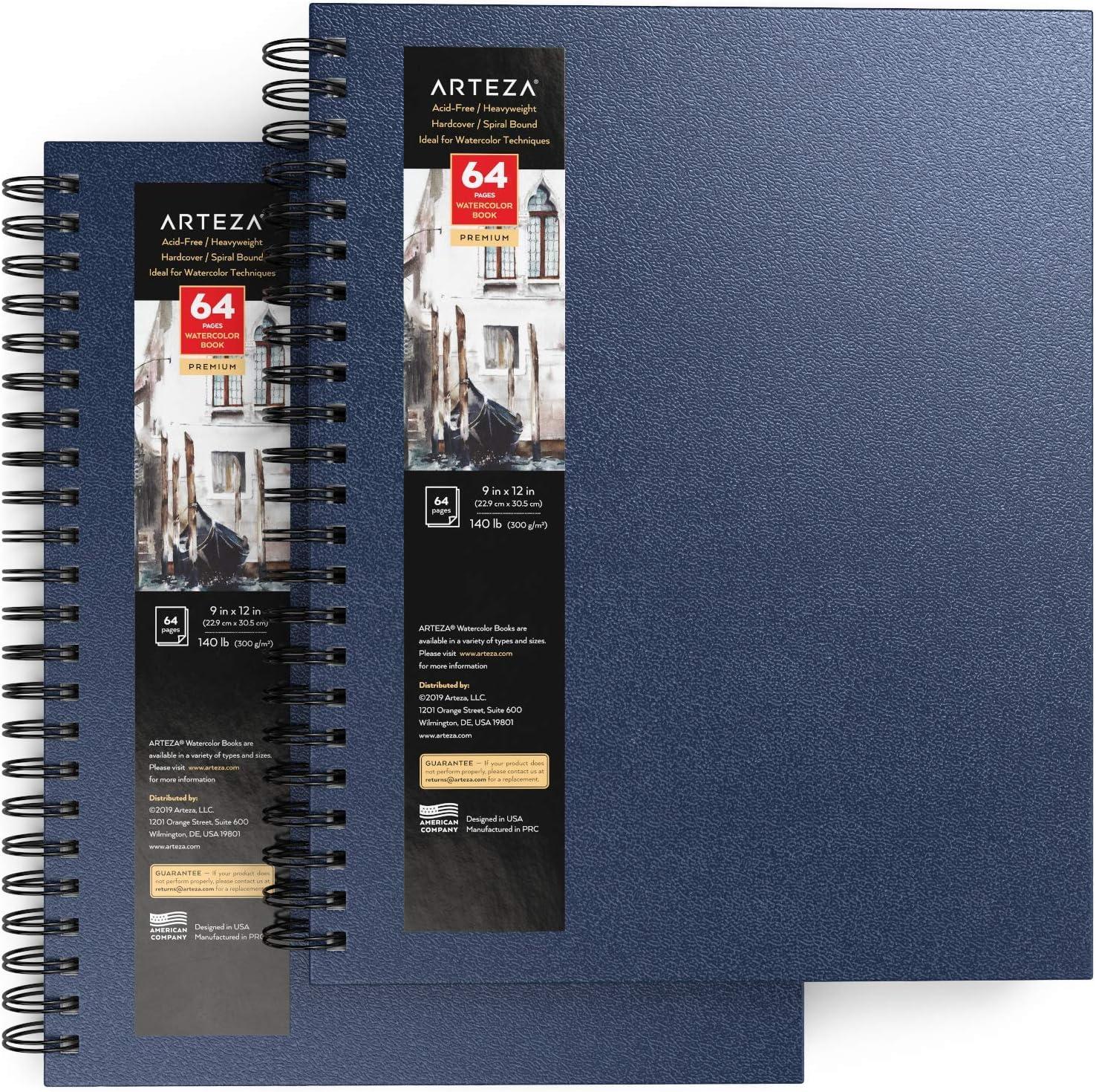 - Two Spiral-Bound Watercolor Pads. Includes two hardcover sketchbooks with 64 sheets of 140 lb watercolor paper each. Spiral binding allows pages to lie flat for easy painting and sketching.