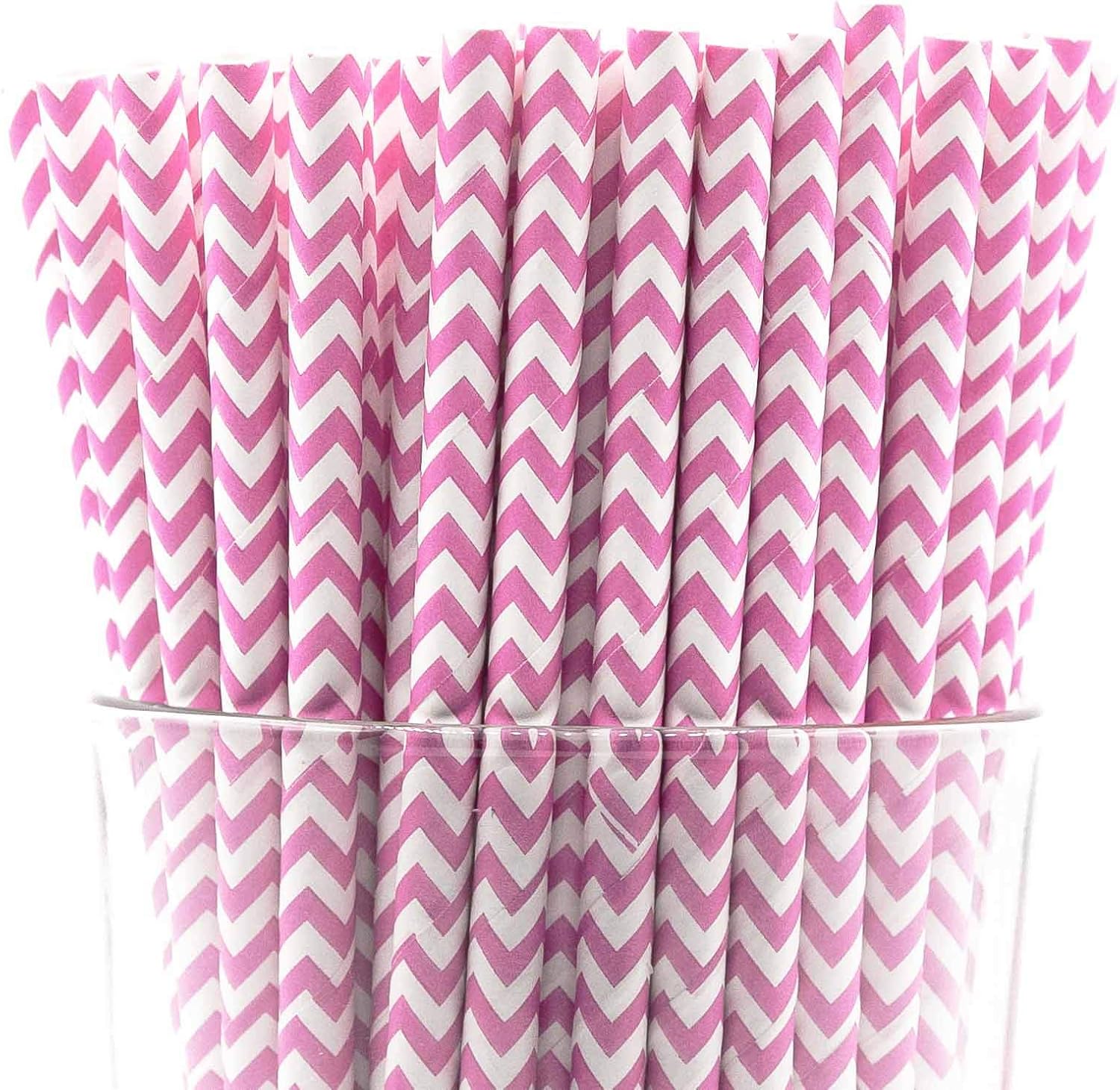 - Pack of 300 Baby Pink Chevron paper straws that are 7.75” long and have a diameter of 0.25”. Made with 4-ply paper which translates into thicker and more resilient straws that won’t wilt or change shape in both hot and cold drinks.