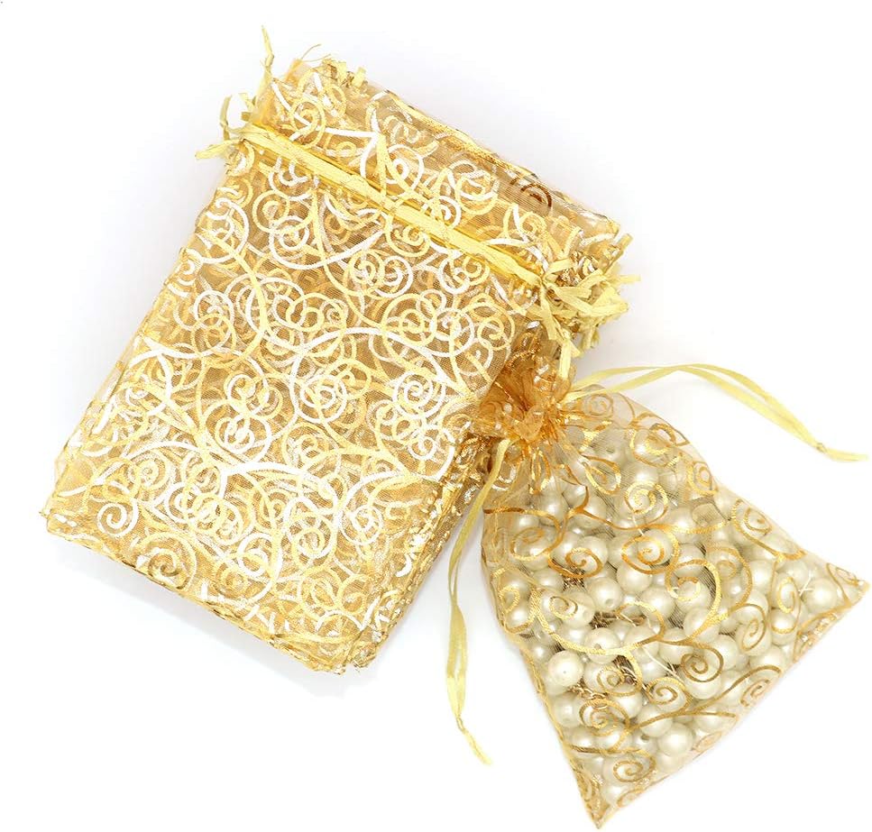 Staruby Organza Gift Bags 100Pcs Gold Sheer Organza Bag 4x6 Inch Mesh Favor Bags Drawstring Jewelry Rattan Printed Gift Pouches for Wedding Party Favors Couple Shower Christmas Gifts Candy Bags