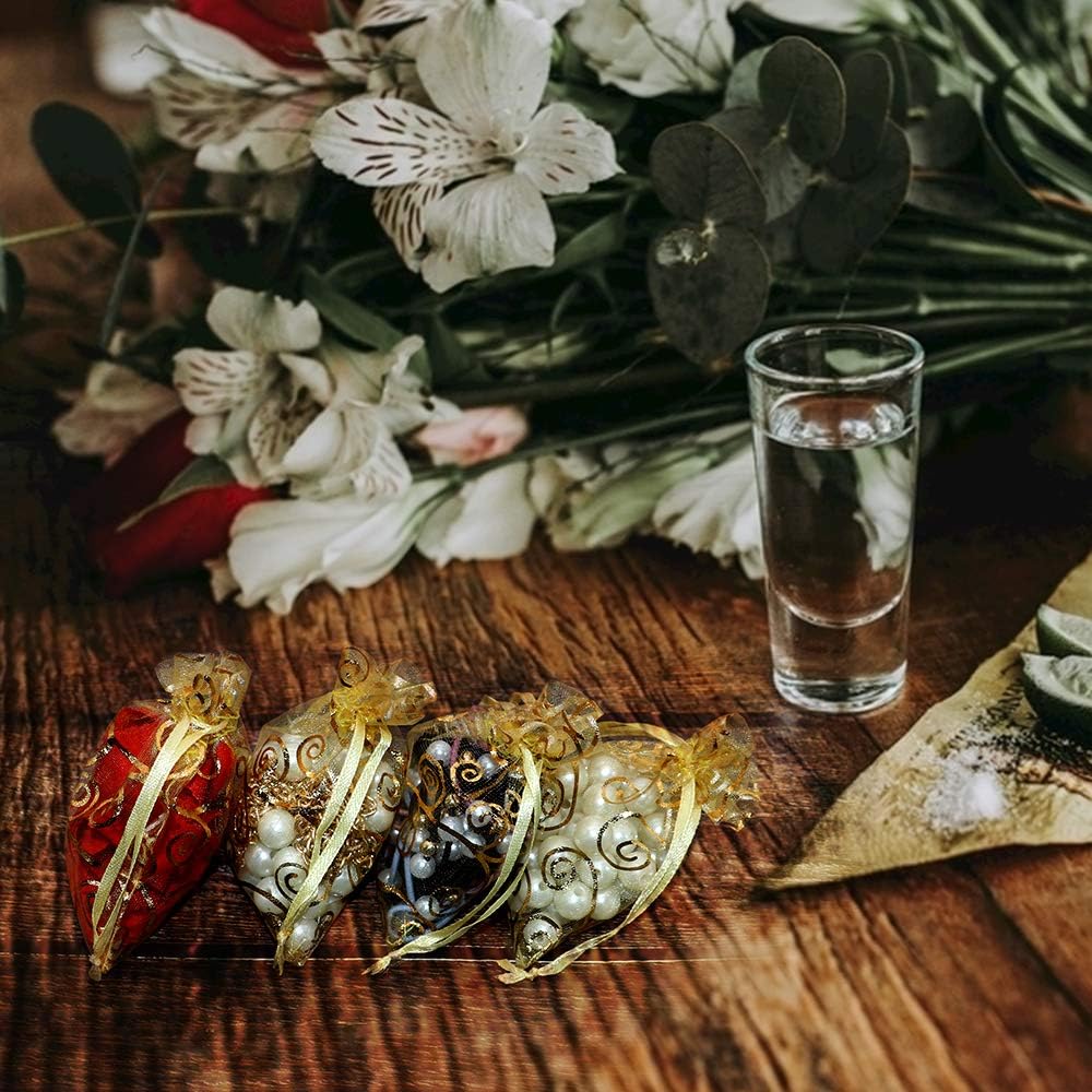 Staruby Organza Gift Bag 100Pcs Gold Sheer Organza Bag Mesh Favor Bags Drawstring Jewelry Rattan Printed Gift Pouches for Wedding Party Favors Couple Shower Christmas Gifts Candy Bags (3x4 Inches)