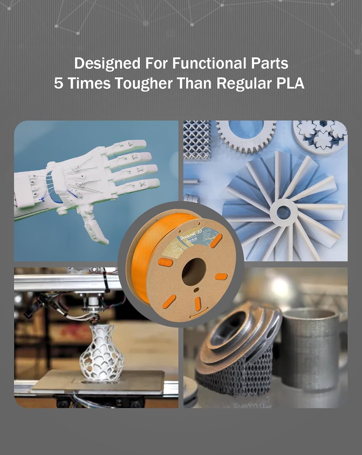 - 【Higher Impact Strength & Toughness】 PLA Plus known as the flagship product of Duramic 3D, PLA Plus filaments (PLA+) 1.75mm are made of USA high-purity raw material from Natureworks. Duramic 3D PLA Pro filaments feature 5 times impact strength , which is perfect for printing functional models with higher toughness need.