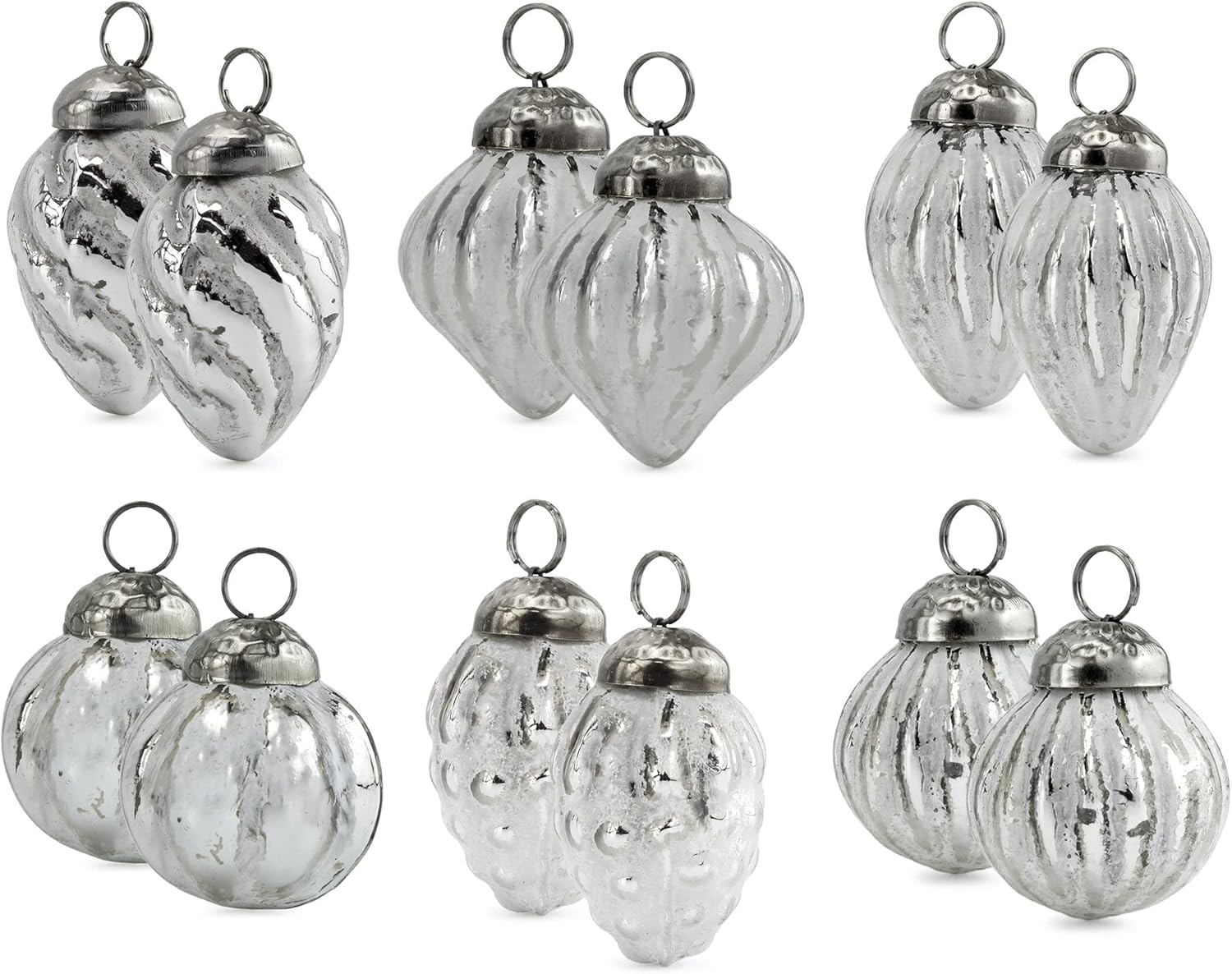 AuldHome Mercury Glass Finial Ornaments (Set of 12, Silver White, Small); Distressed Metal Antique Style Christmas Tree Decorations; 1.3 to 2-Inch Size