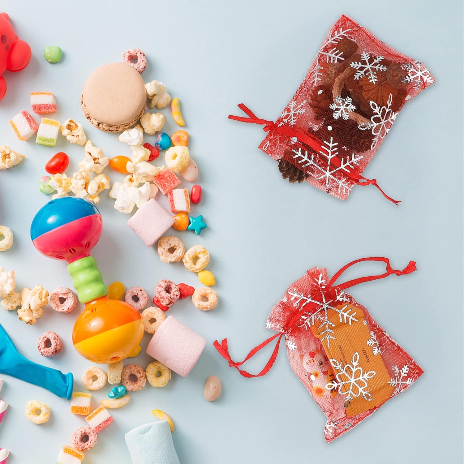 jijAcraft 3x4 Inch Christmas Organza Bags - 100Pcs Red Snowflake Gift Bags with Drawstring, Xmas Party Favor Sheer Mesh Pouches for Winter Gift, Candy, Jewelry Bag