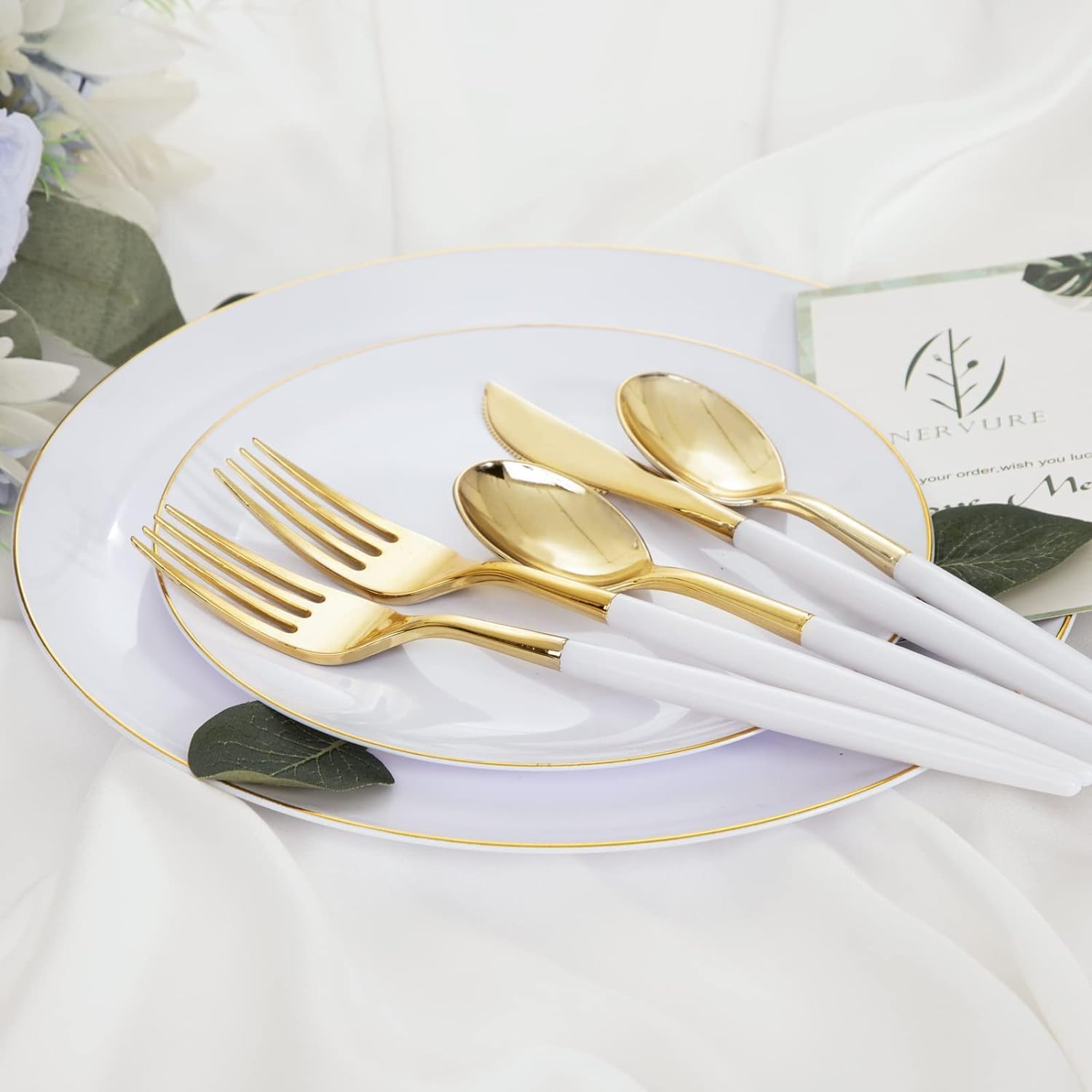 - Occasions: Shinning gold plastic silverware matched white handle adds some style and elegance to your Dinner,Mother's day, Birthday Party, Wedding, Christmas, Thanksgiving, New Years Eve and every occasions. Our gold disposable cutlery turning your party into a glamorous affair.