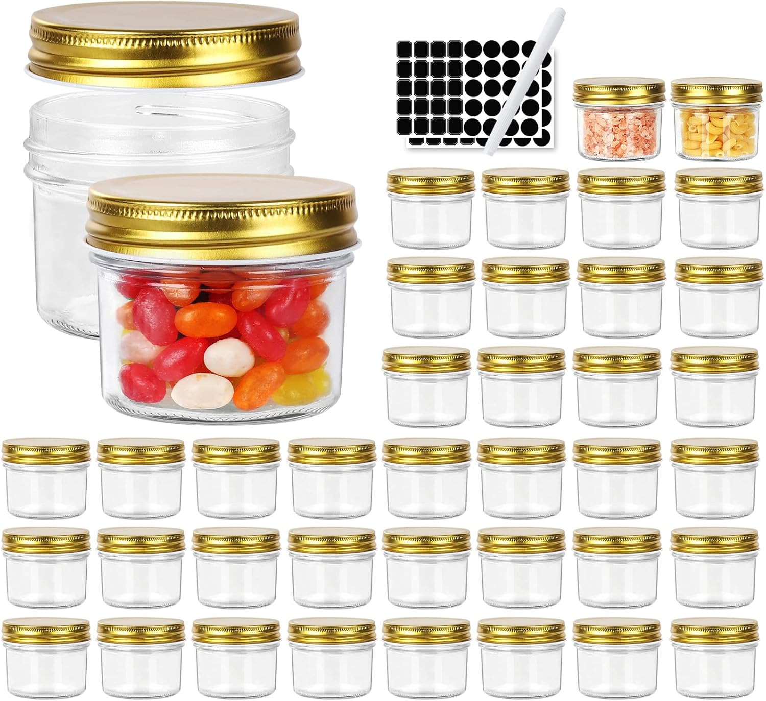 - Package Included: 40 pack 4 oz glass jars with 40 golden lids, extra 40 blank labels for labeling, mark your own jars. Jar Size: 2.4in base width, 2.2in height, 2.6in mouth diameter