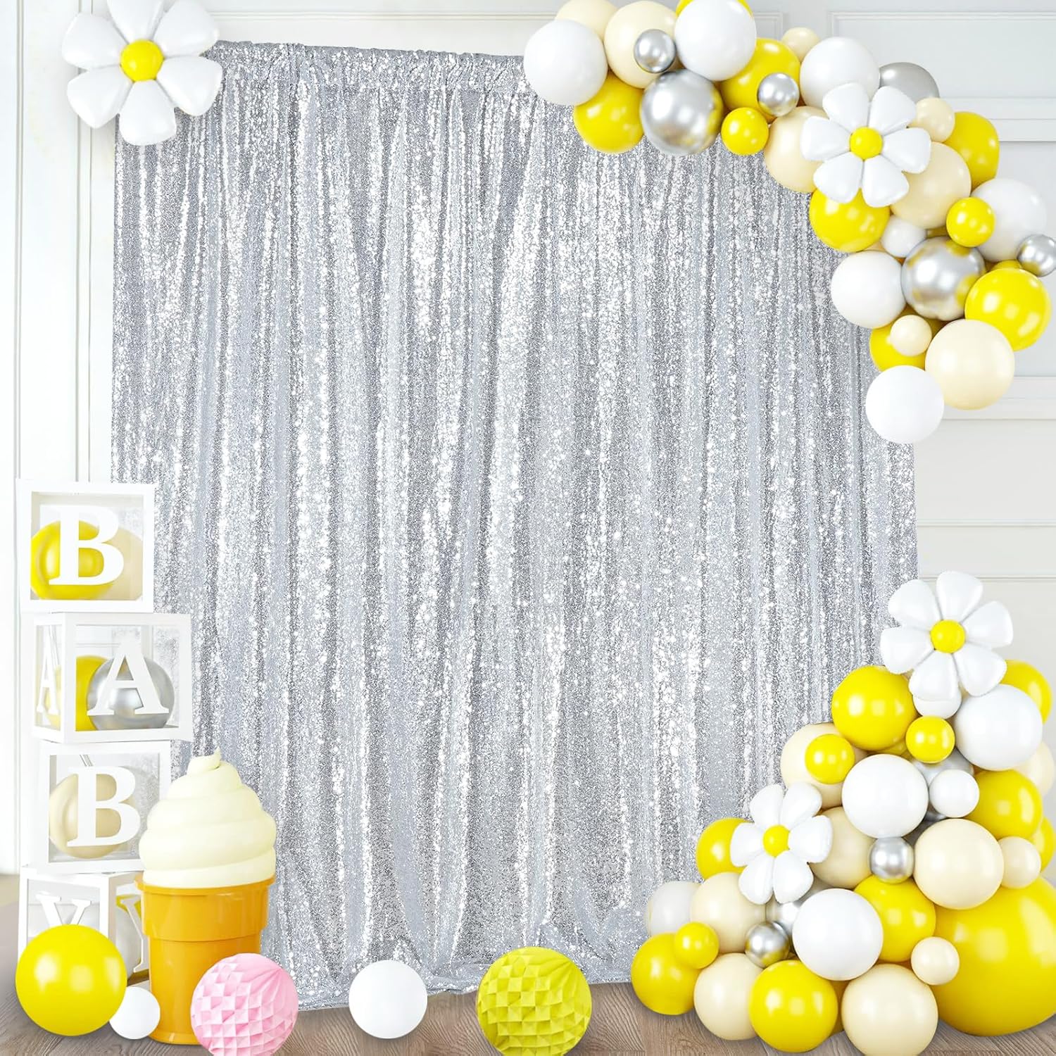8ft x 8ft Silver Sequin Backdrop Curtain Glitter Photo Booth Backdrop for Wedding Birthday Baby Shower Event Decorations