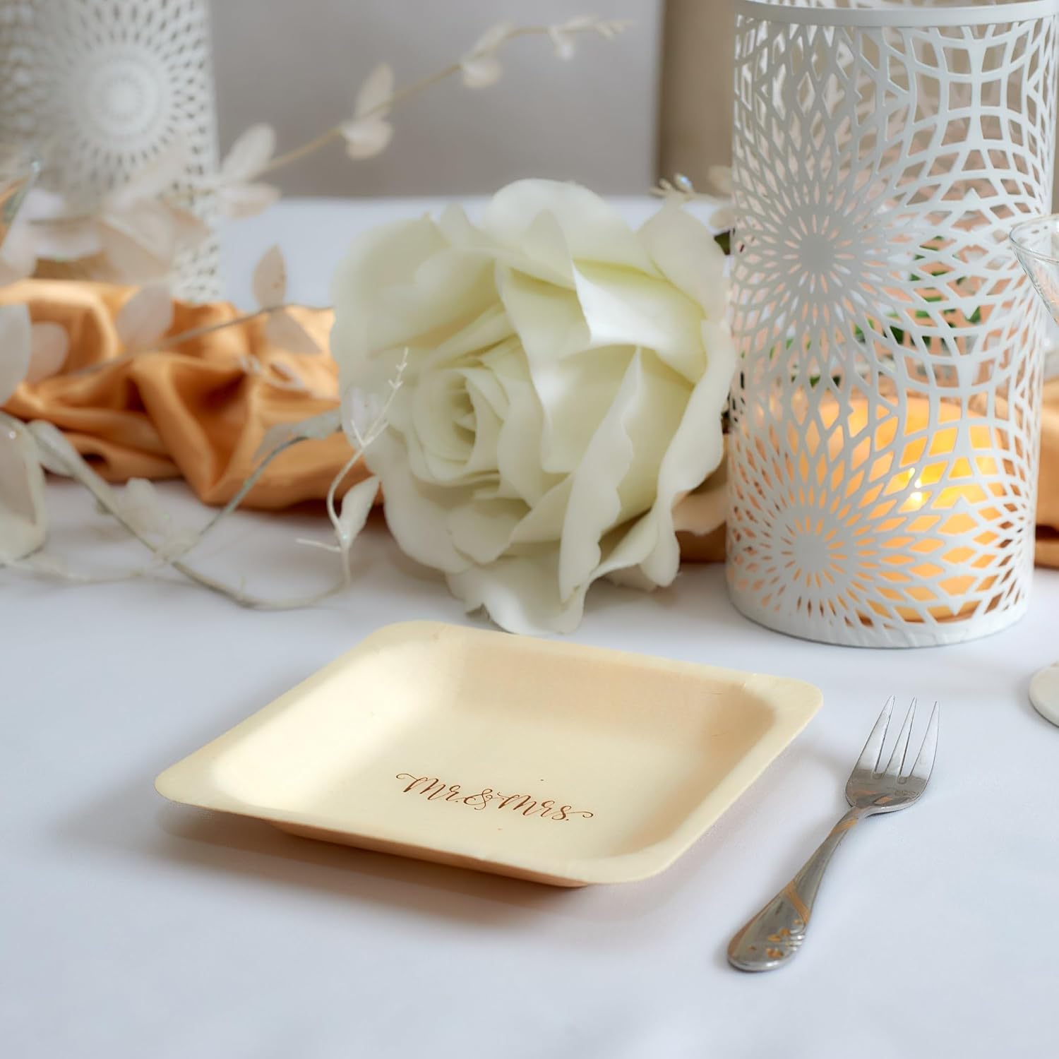 - π Youβve never seen fancy disposable plates like these! Featuring "Mr & Mrs" in beautiful hand-lettered calligraphy, these plates are sure to add an unforgettable touch to your special day.