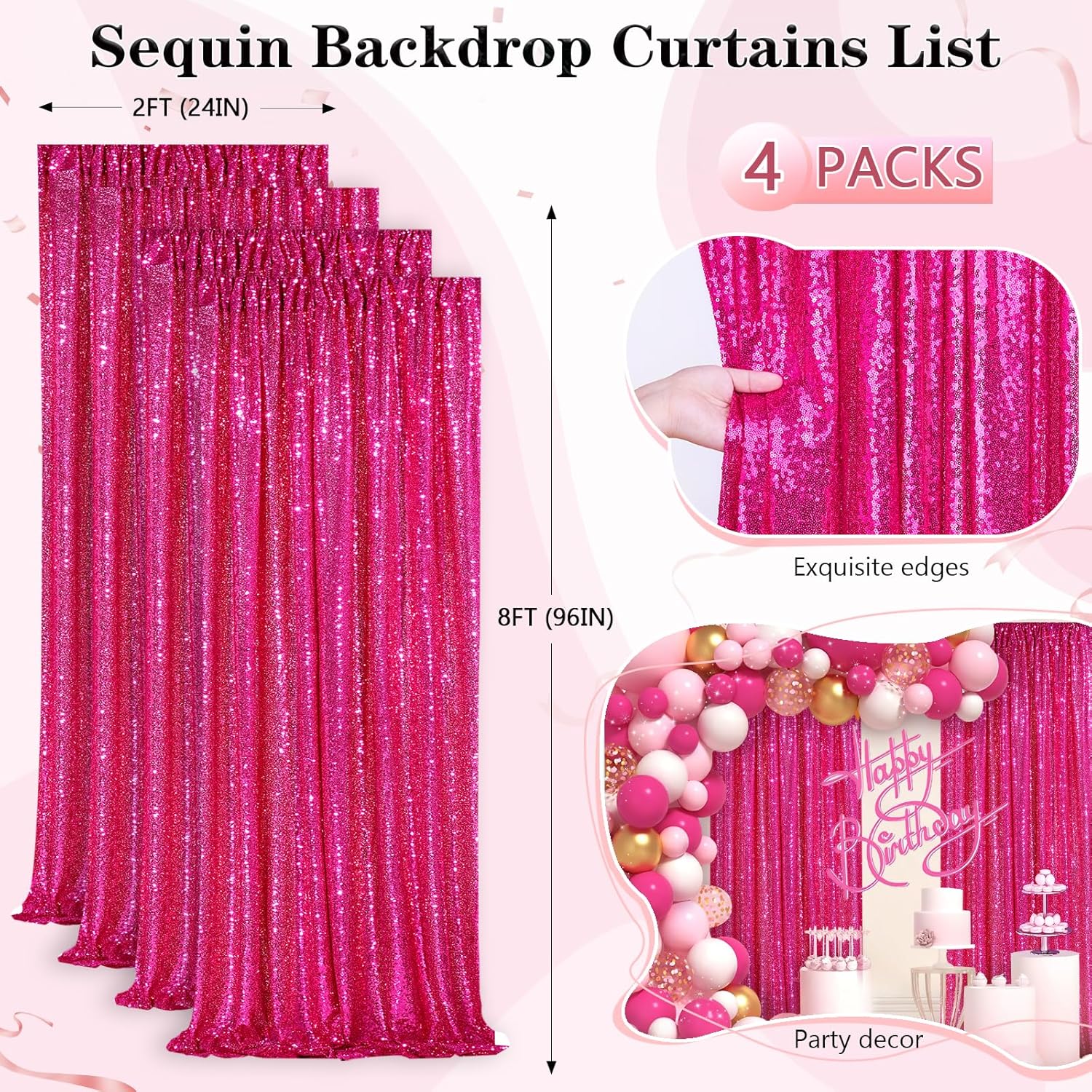 - Sparkly Fuchsia Sequin Backdrop: Pack 4 2FT Wide X 8FT Height fuchsia sequin backdrop. Creating the perfect ambiance for your wedding or other party.