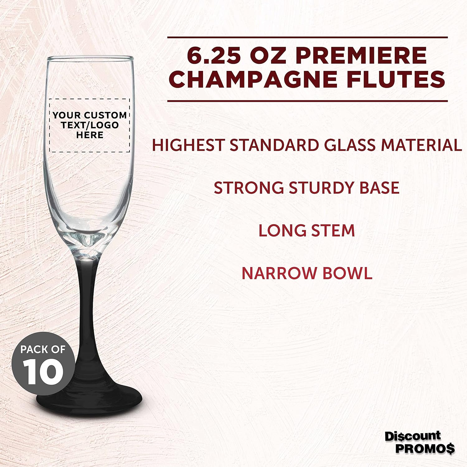 DISCOUNT PROMOS Custom Premiere Champagne Flutes 6.25 oz. Set of 10, Personalized Bulk Pack - Elegant Drinkware for Weddings, Events, & Promotional Gifts - Black