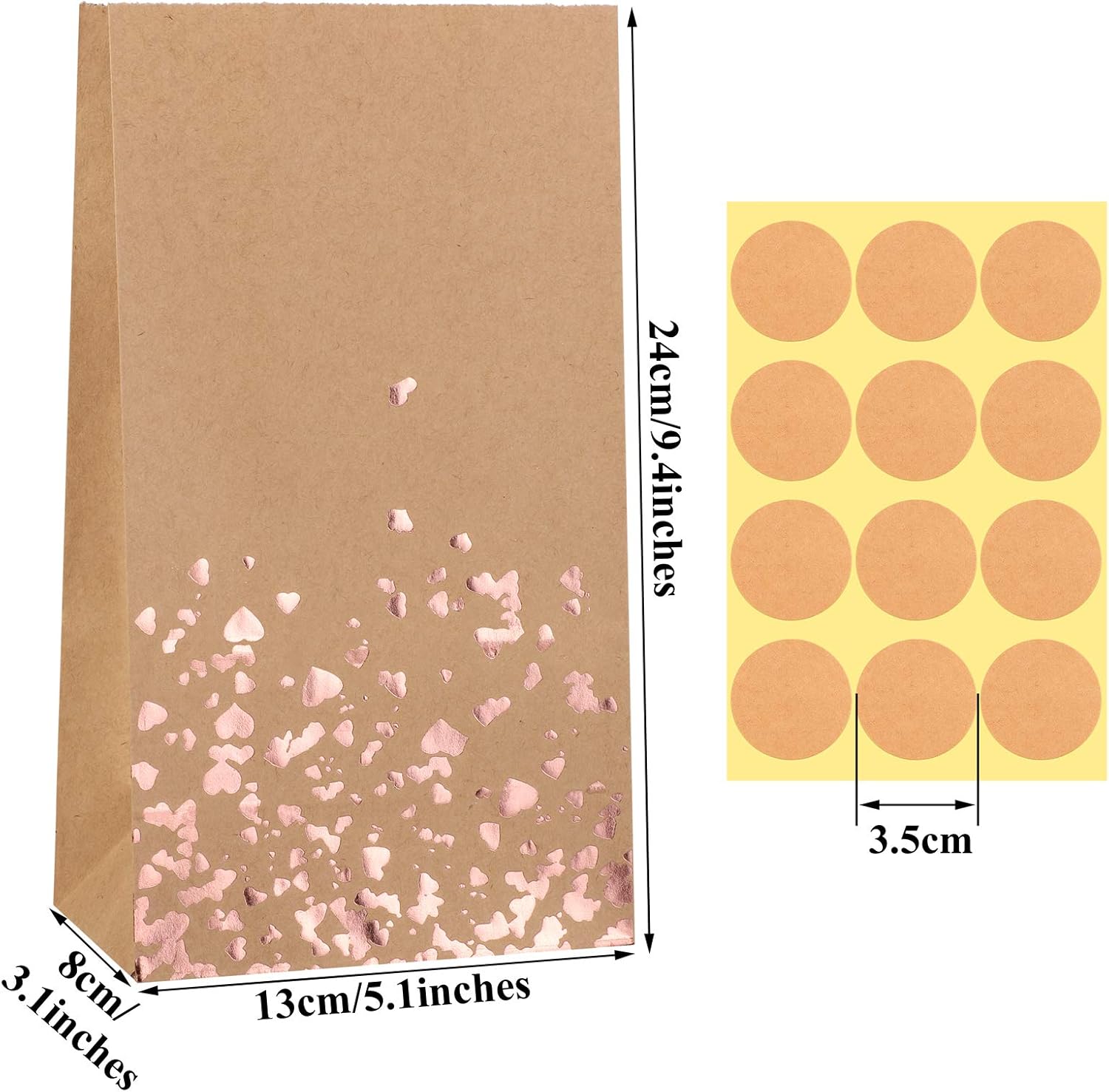 - Style: brown kraft paper printed with different sizes of rose gold hearts, classic and fashion, these bags are suitable for all kinds of party use, can also be party decorations, practical and beautiful