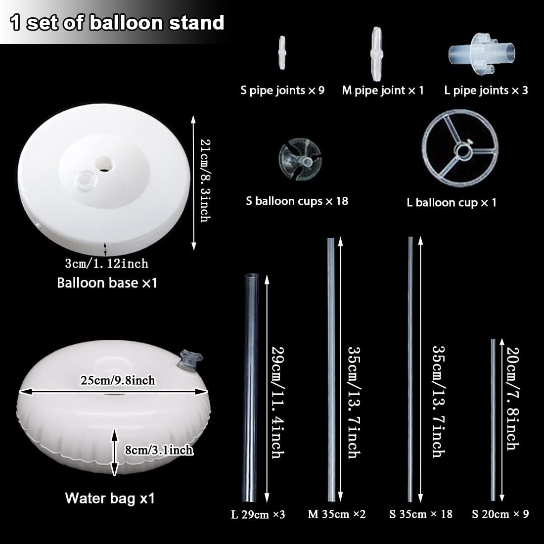 - Package includes:2 set of clear balloon stand (19 Balloon Cups,1 PVC Balloon Base,Several Balloon Sticks, several connectors ), 2 pcs fillable water bases and 1 pack balloon tying knot tool. We have added fillable water bases to make the balloon column more stability.