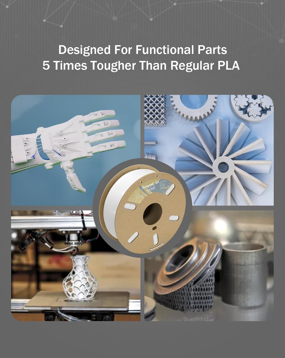- 【Jam-free& Smooth Printing】Duramic 3D PLA plus filament features unique patented Jam-free technology and 100% vacuumed package in resealable with desiccant, which makes no room for clogging and bubbling.