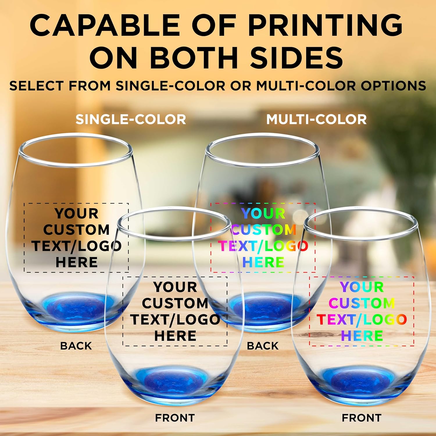 Custom Stemless Wine Glass 9 oz. Set of 50, Personalized Bulk Pack - Great for Wedding Favors, Bachelorette Party Decorations, Party Favors, Color Bottom - Blue