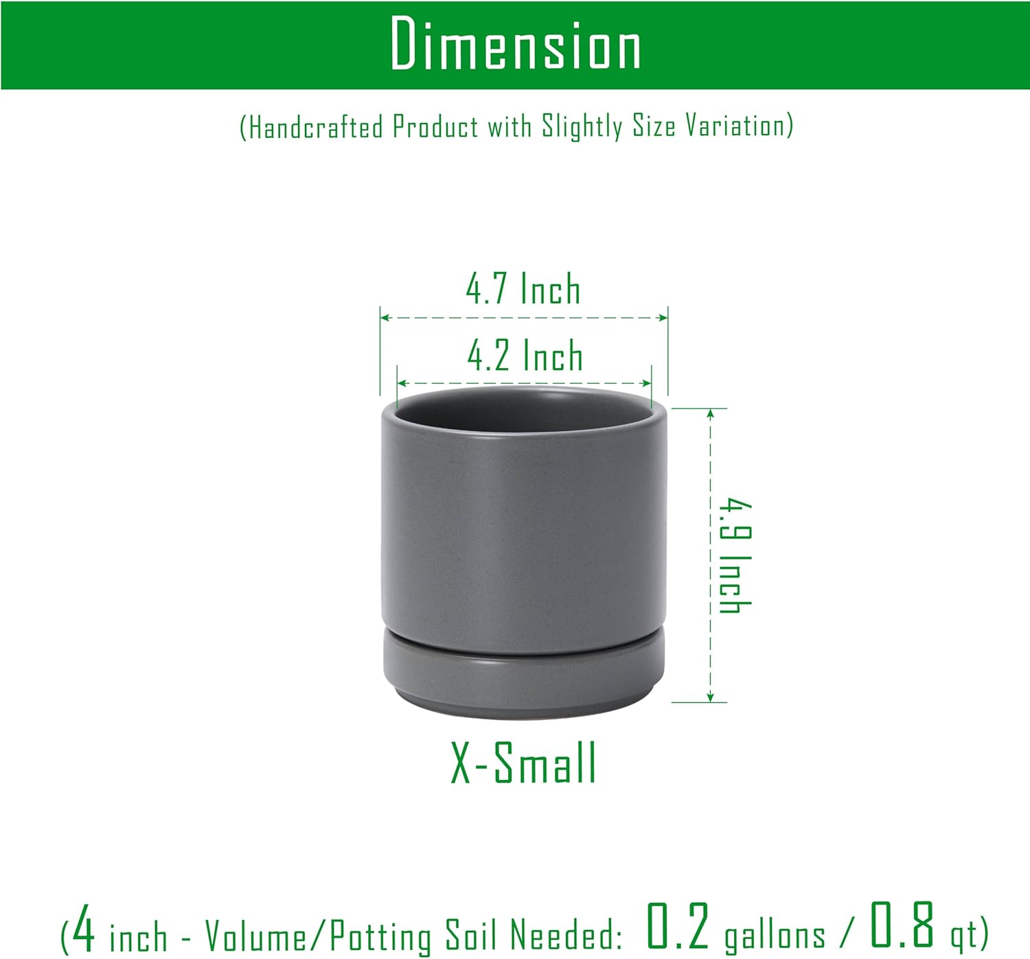 - Set of 4 Small Planter Pots - 4.7" Diameter (4.2" Inner Diameterrr) * 4.9" Height. Volume: 0.2 gallons; Potting Soil Needed 0.8 qt.