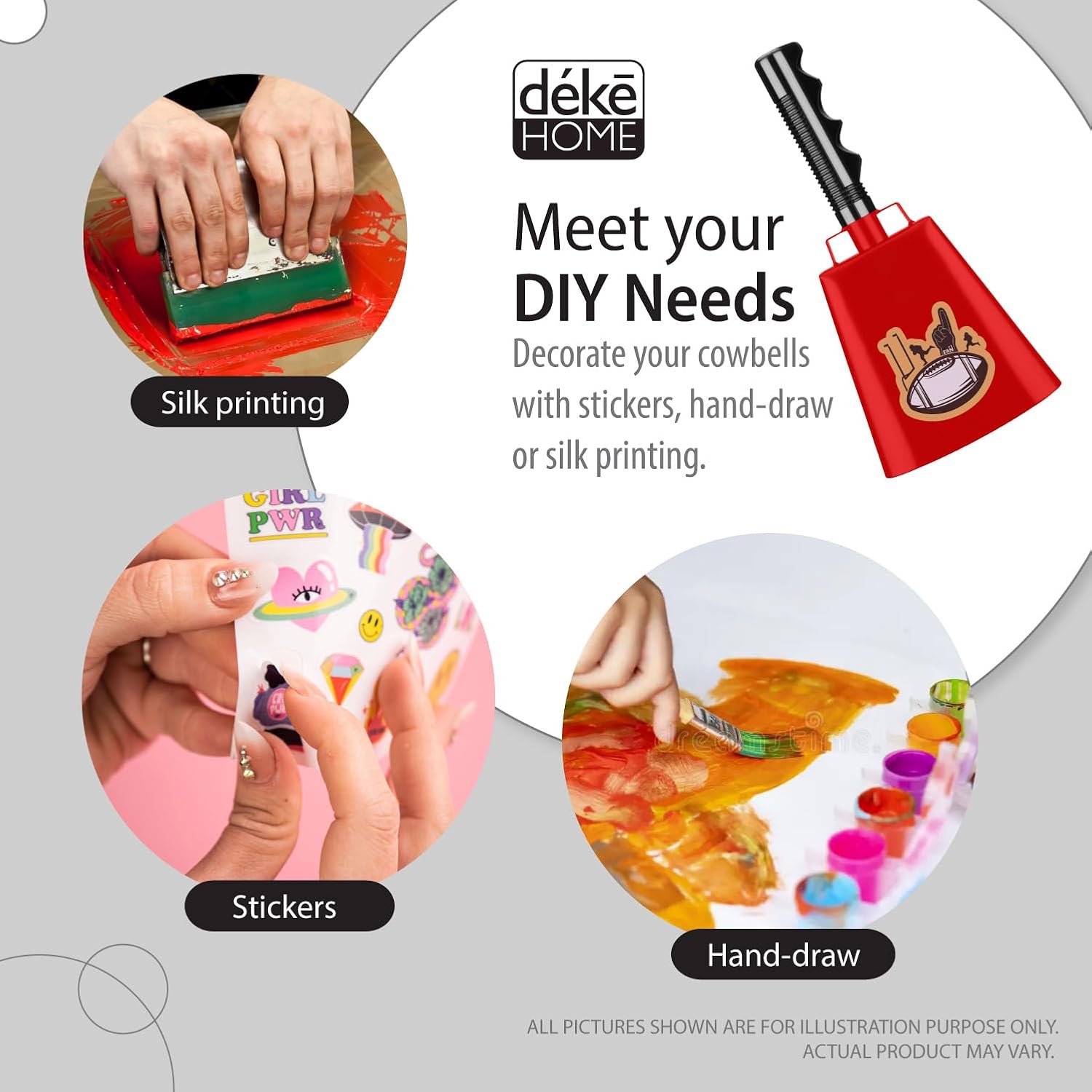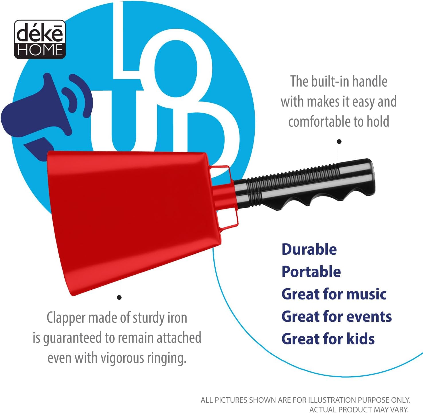 Deke Home - 2 Pack 10 Inch Steel Cowbells with Handle, Loud Noise Makers for Football, Sports, Parties, Competitions, School Spirit & Safety, Large Hand Bell for Cheering & Percussion Instrument