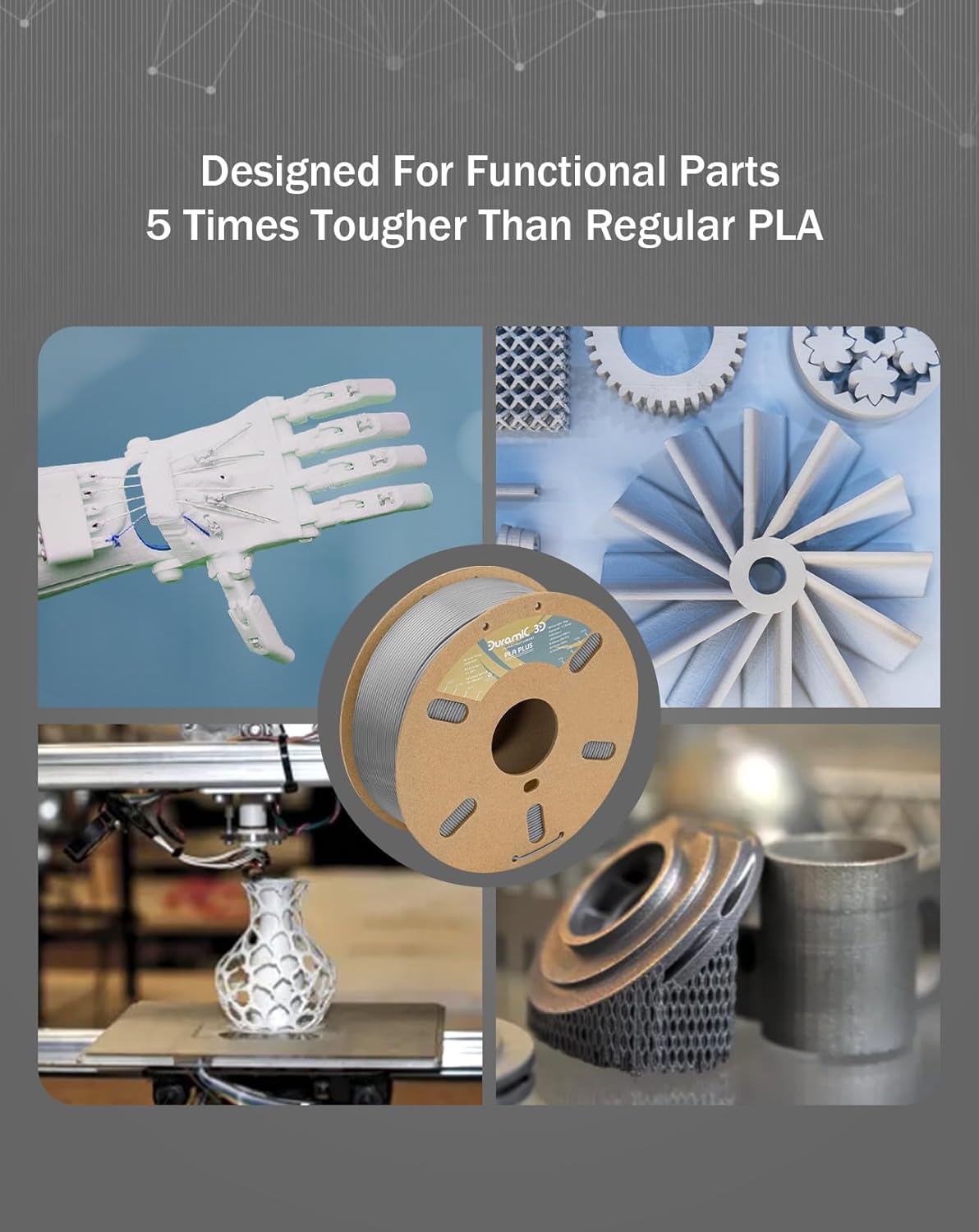- 【Higher Impact Strength & Toughness】 PLA Plus known as the flagship product of Duramic 3D, PLA Plus filaments (PLA+) 1.75mm are made of USA high-purity raw material from Natureworks. Duramic 3D PLA Pro filaments feature 5 times impact strength , which is perfect for printing functional models with higher toughness need.