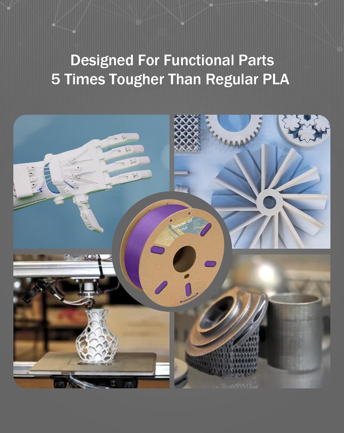 - 【Higher Impact Strength & Toughness】 PLA Plus known as the flagship product of Duramic 3D, PLA Plus filaments (PLA+) 1.75mm are made of USA high-purity raw material from Natureworks. Duramic 3D PLA Pro filaments feature 5 times impact strength , which is perfect for printing functional models with higher toughness need.