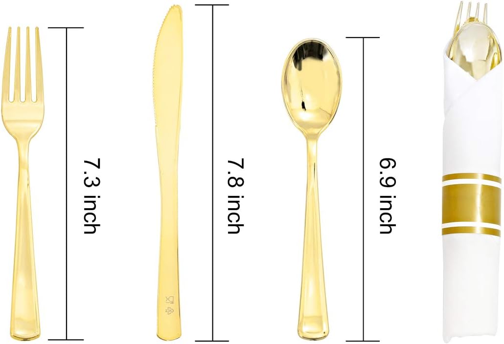- Value Pack: the gold disposable silverware include 60 forks 7.3", 60 knives 7.8", 60 spoons 6.9"οΌ60 Napkins. Gold plastic silverware are suit for any occasion, also make a great gift for people who like enjoyable entertaining and casual everyday elegance.