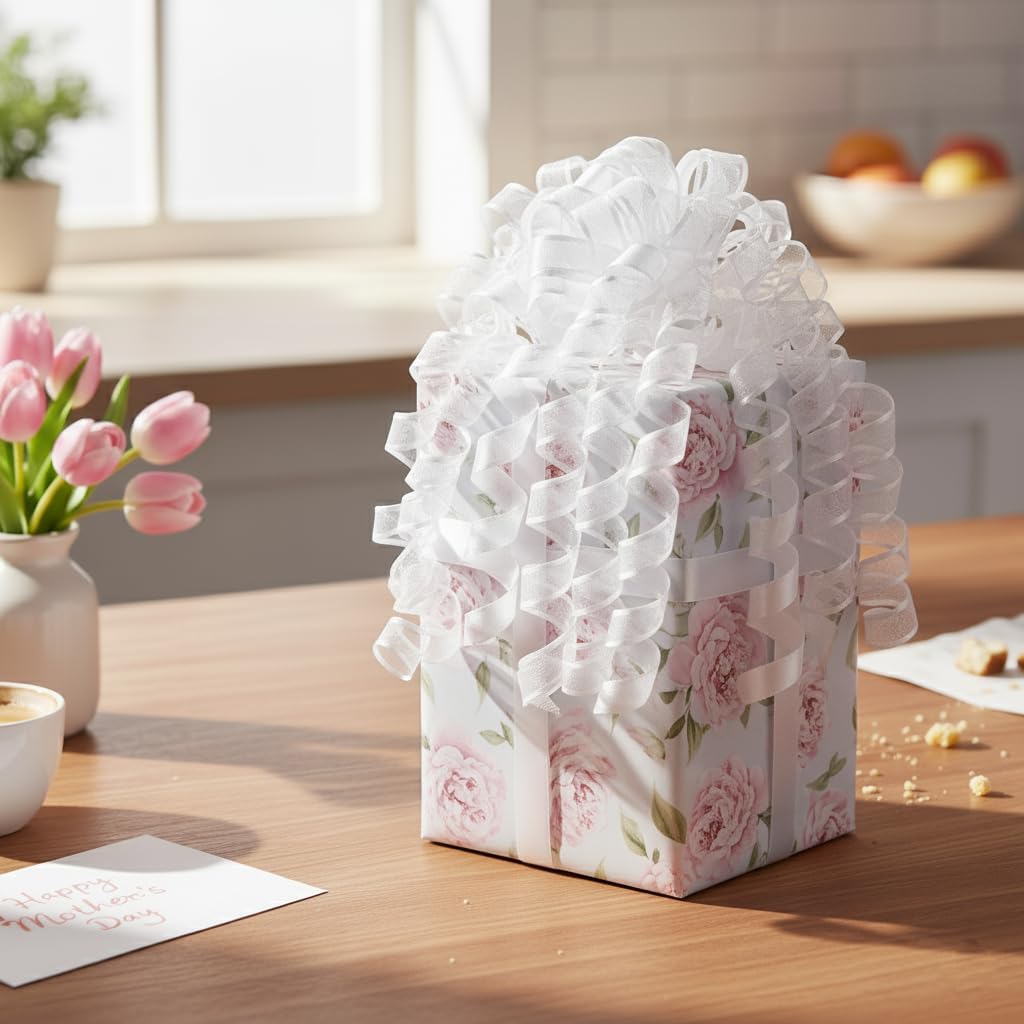 - SIMPLE YET ELEGANT - This pre-made gift White Satin and Sheer Curly ribbon bows matches any type of gift wrapping paper and it looks great on plain or brown gift wrapping paper or cellophane and also can be used in crafting, festivals, wine bottles, favors bags, candy boxes, flower bunch, fruit basket etc. Perfect for Christmas, Party, Hanukkah, birthdays, weddings, Mother's Day, baby showers, graduation,